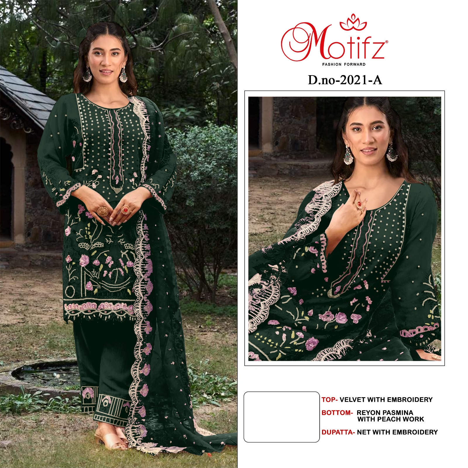 Buy Online Motifz Design No 2021a Velvet Embroidered Suit 5 Pcs of Full Catalogue at Wholesale Price. Looking for Motifz Design No 2021a Velvet Embroidered Suit Full Catalouge at Best Price? Buy Now Motifz Design No 2021a Velvet Embroidered Suit at Wholesale Rate of Rs 6500 with Total 5 Pcs from authroized dealer and supplier of Brand. Cost of Each piece is just only Rs 1300 which is very low and affordable price to resale the product in your retail store ,This is Surat based Wholesale Supplier & Dealer of Brand. Click on Brand name to Know more about Brand's products.Call or Whatsapp on 9898838984 for booking or enquiry