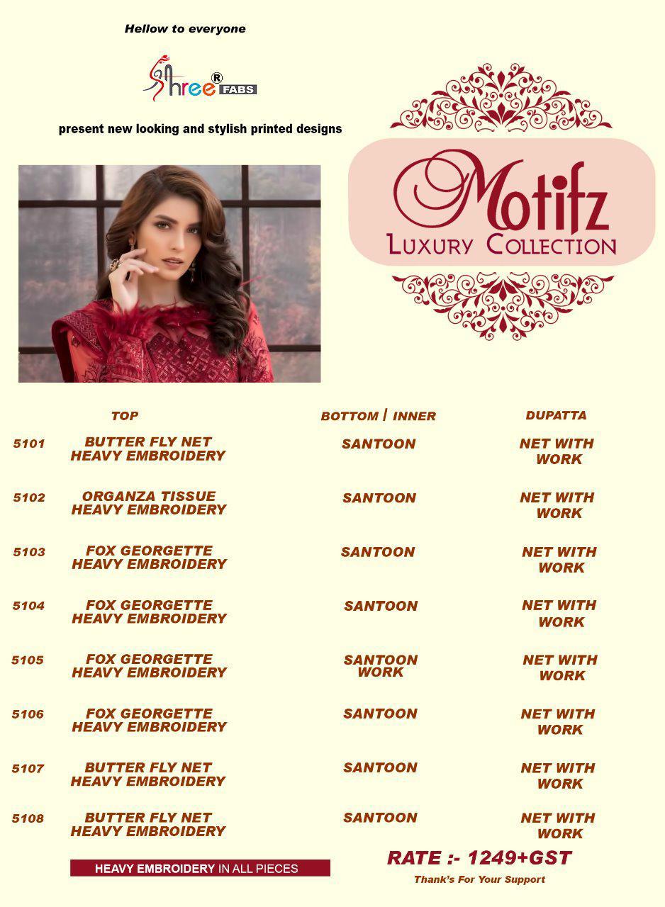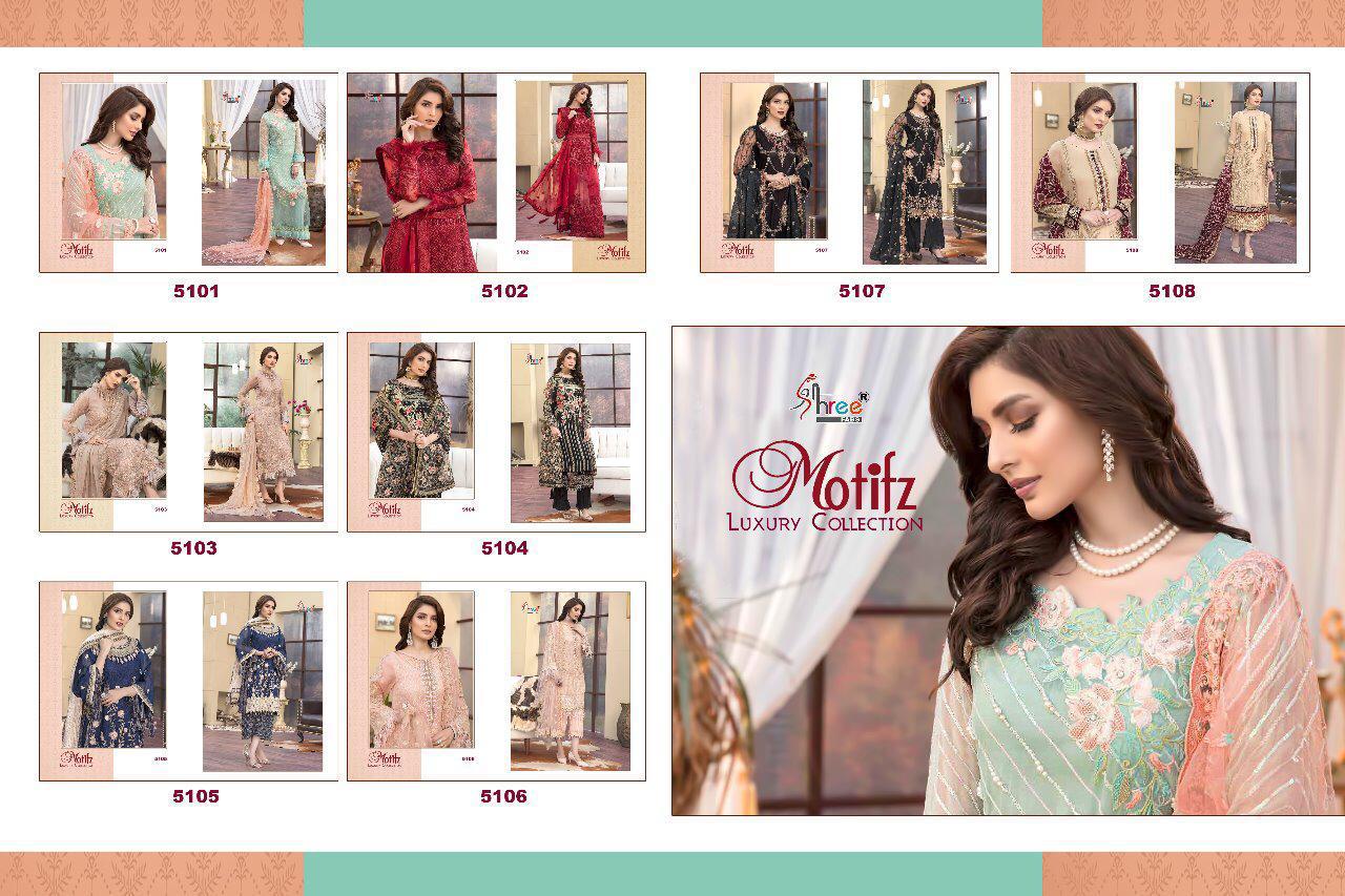 Buy Online Motifz Luxury Collection By Shree Fabs 5101 Series Fancy Pakistani Style Salwar Kameez Catlog Wholesaler Surat 8 Pcs of Full Catalogue at Wholesale Price. Looking for Motifz Luxury Collection By Shree Fabs 5101 Series Fancy Pakistani Style Salwar Kameez Catlog Wholesaler Surat Full Catalouge at Best Price? Buy Now Motifz Luxury Collection By Shree Fabs 5101 Series Fancy Pakistani Style Salwar Kameez Catlog Wholesaler Surat at Wholesale Rate of Rs 9992 with Total 8 Pcs from authroized dealer and supplier of SHREE FABS Brand. Cost of Each piece is just only Rs 1249 which is very low and affordable price to resale the product in your retail store ,This is Surat based Wholesale Supplier & Dealer of SHREE FABS Brand. Click on Brand name to Know more about SHREE FABS Brand's products.Call or Whatsapp on 9898838984 for booking or enquiry