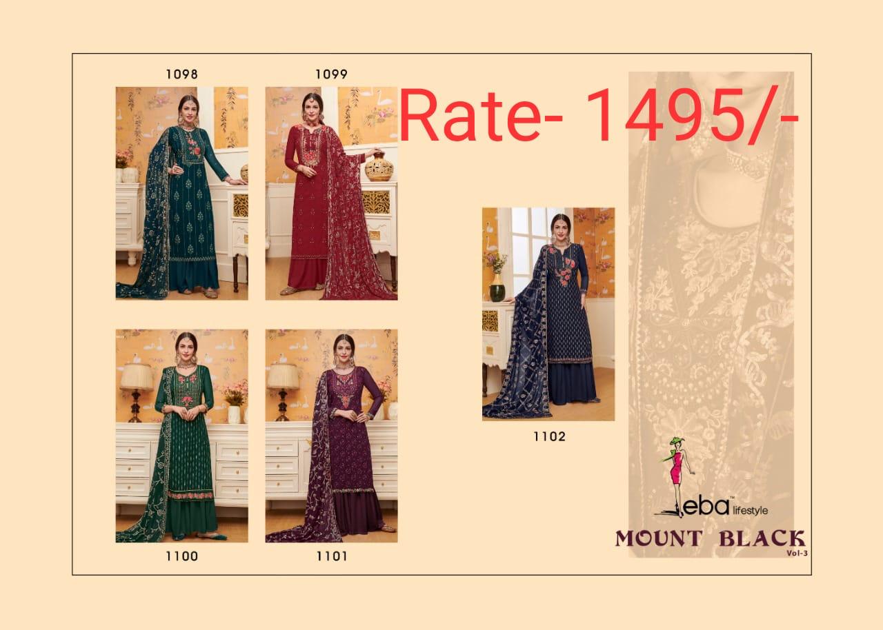 Buy Online Mount Black Vol 3 By Eba Lifestyle Series 1098 Designer Party Wear Suits Wholesale Supplier Gujarat 5 Pcs of Full Catalogue at Wholesale Price. Looking for Mount Black Vol 3 By Eba Lifestyle Series 1098 Designer Party Wear Suits Wholesale Supplier Gujarat Full Catalouge at Best Price? Buy Now Mount Black Vol 3 By Eba Lifestyle Series 1098 Designer Party Wear Suits Wholesale Supplier Gujarat at Wholesale Rate of Rs 7475 with Total 5 Pcs from authroized dealer and supplier of Eba Lifestyle Brand. Cost of Each piece is just only Rs 1495 which is very low and affordable price to resale the product in your retail store ,This is Surat based Wholesale Supplier & Dealer of Eba Lifestyle Brand. Click on Brand name to Know more about Eba Lifestyle Brand's products.Call or Whatsapp on 9898838984 for booking or enquiry