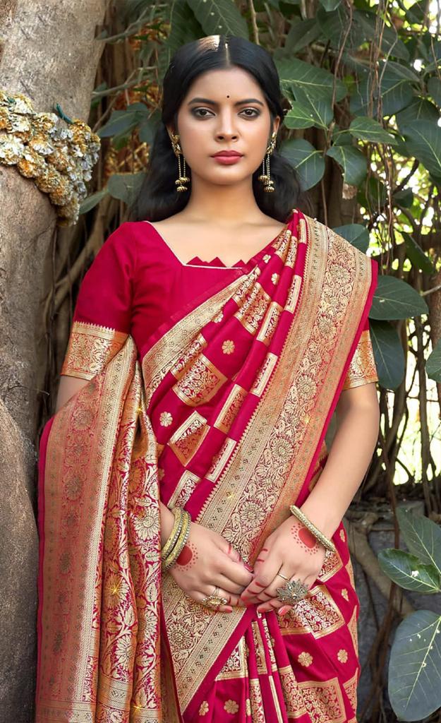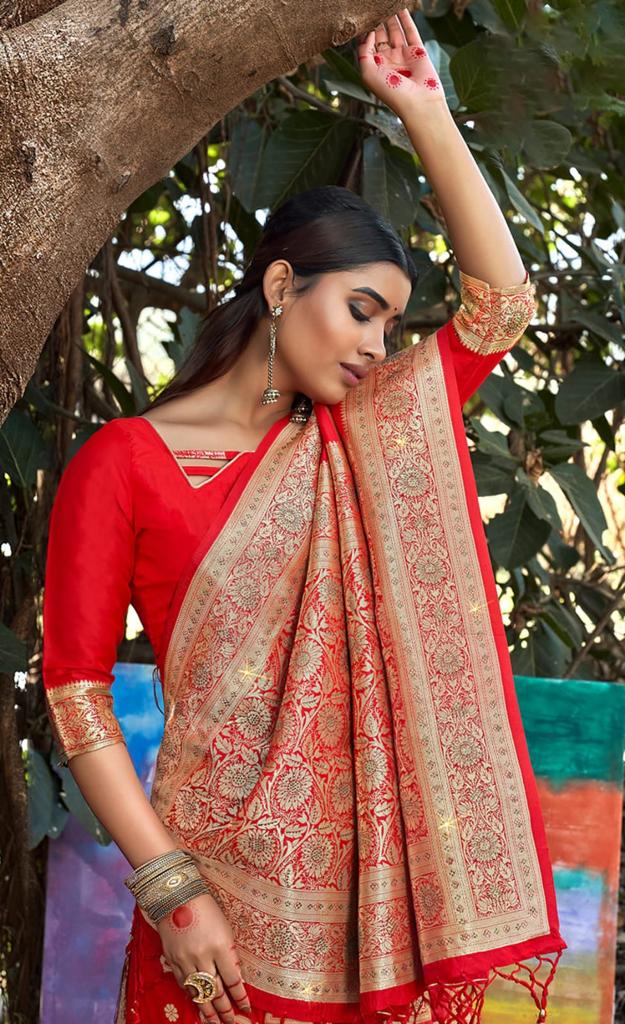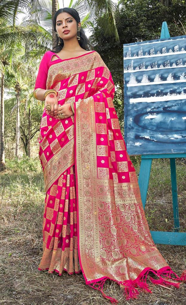 ? *New Catalog Exclusively Launching From Our Newly Launched Brand:- BUNAWAT* ? Catalog Name: *MRIGNYANI* Brand: *BUNAWAT* Product Type: Saree Fabric: Banarasi Silk Price Per Piece: 1550/- Gst Extra: 5% Work: Woven Work Other Specifications: Tassels on Pallu Saree Mtr: 5.5 Mtr Blouse: 0.8 Mtr Total Pcs: 6 _*Book your orders now*_ 100+single |