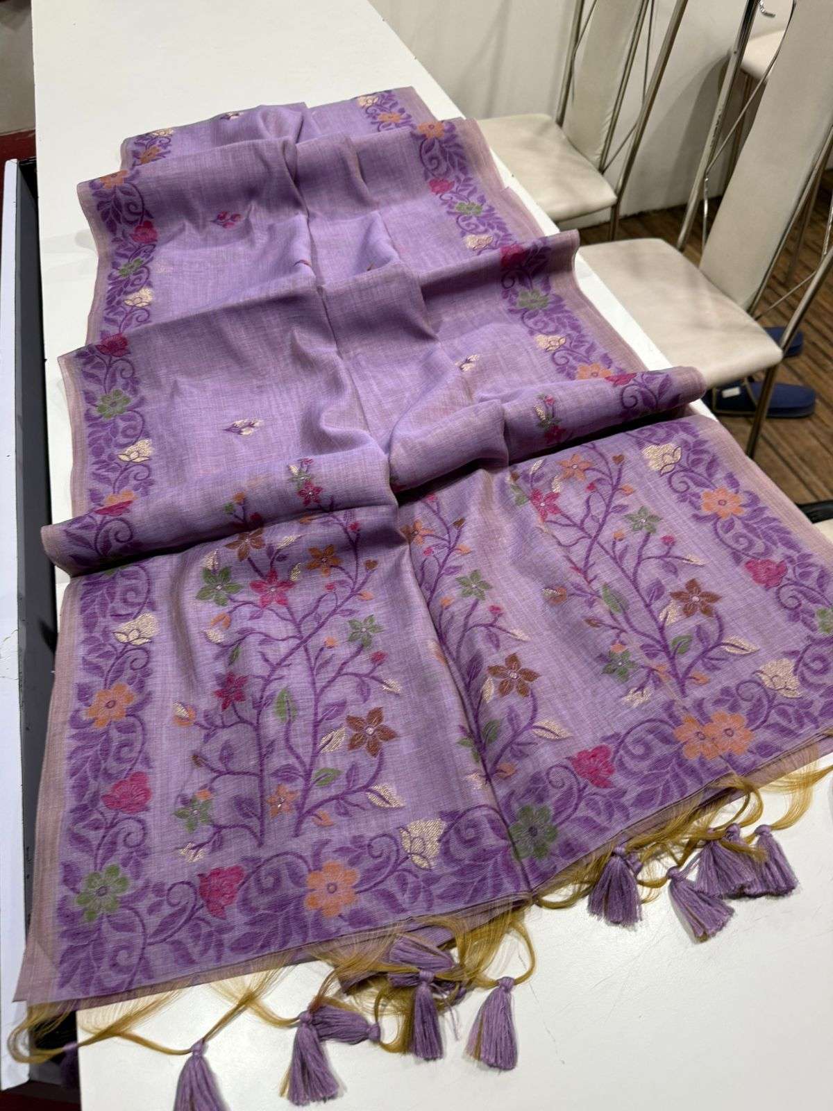 Grace your wardrobe with this Premium Soft Muga Cotton Saree, showcasing a classic colourful resham weaving Jamdani pallu that blends tradition with elegance. Accented by a decent colour-touch weaving border, the saree features all-over weaving buttis for a rich yet subtle look. Completed with fancy tassels and a running blouse piece, it’s perfect for festive wear and elegant daily styling. ✨ Fabric: Premium Soft Muga Cotton 📽️ Real video attached for reference |