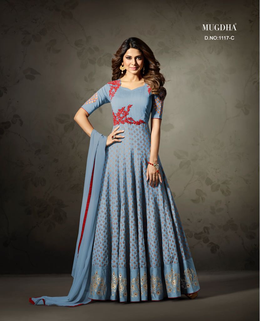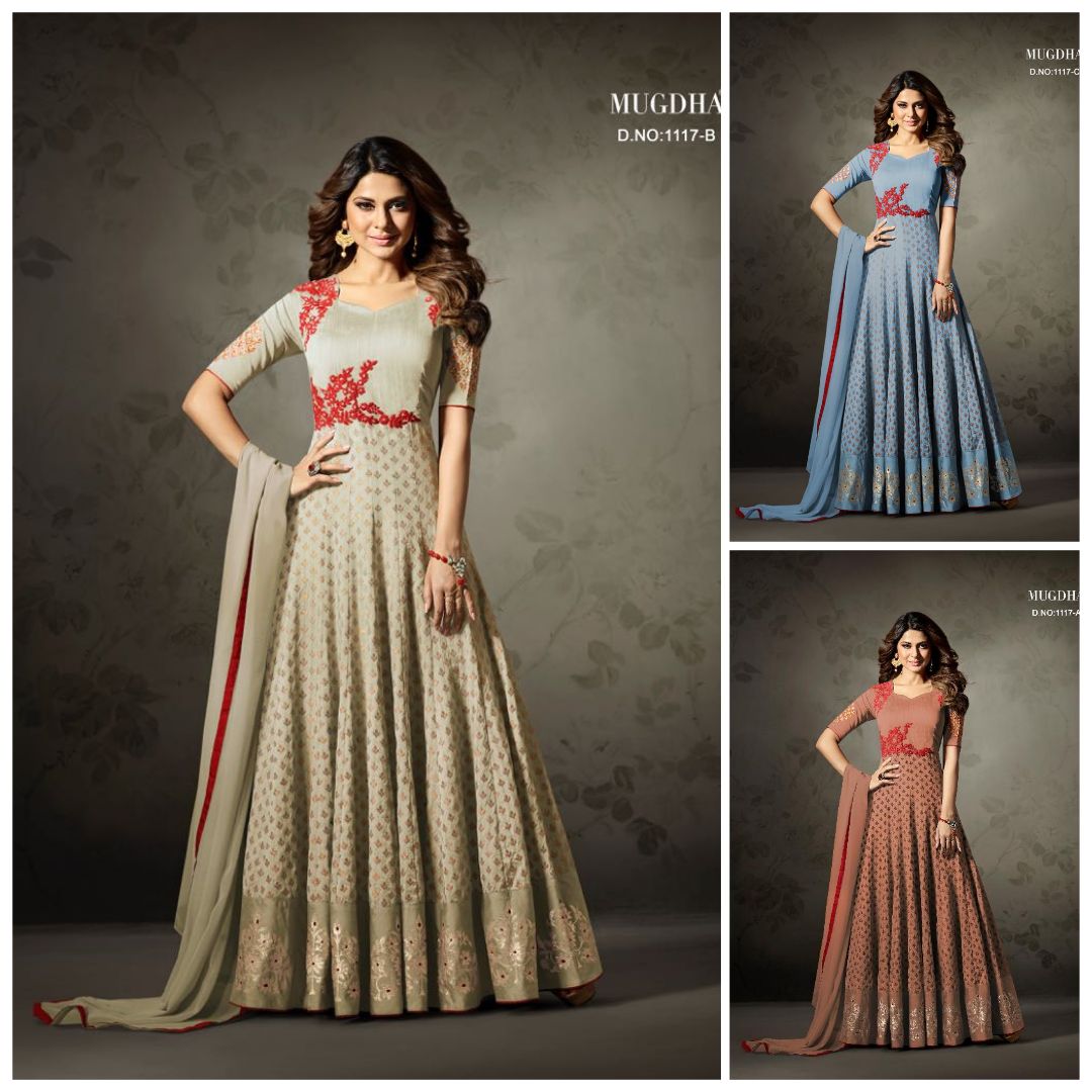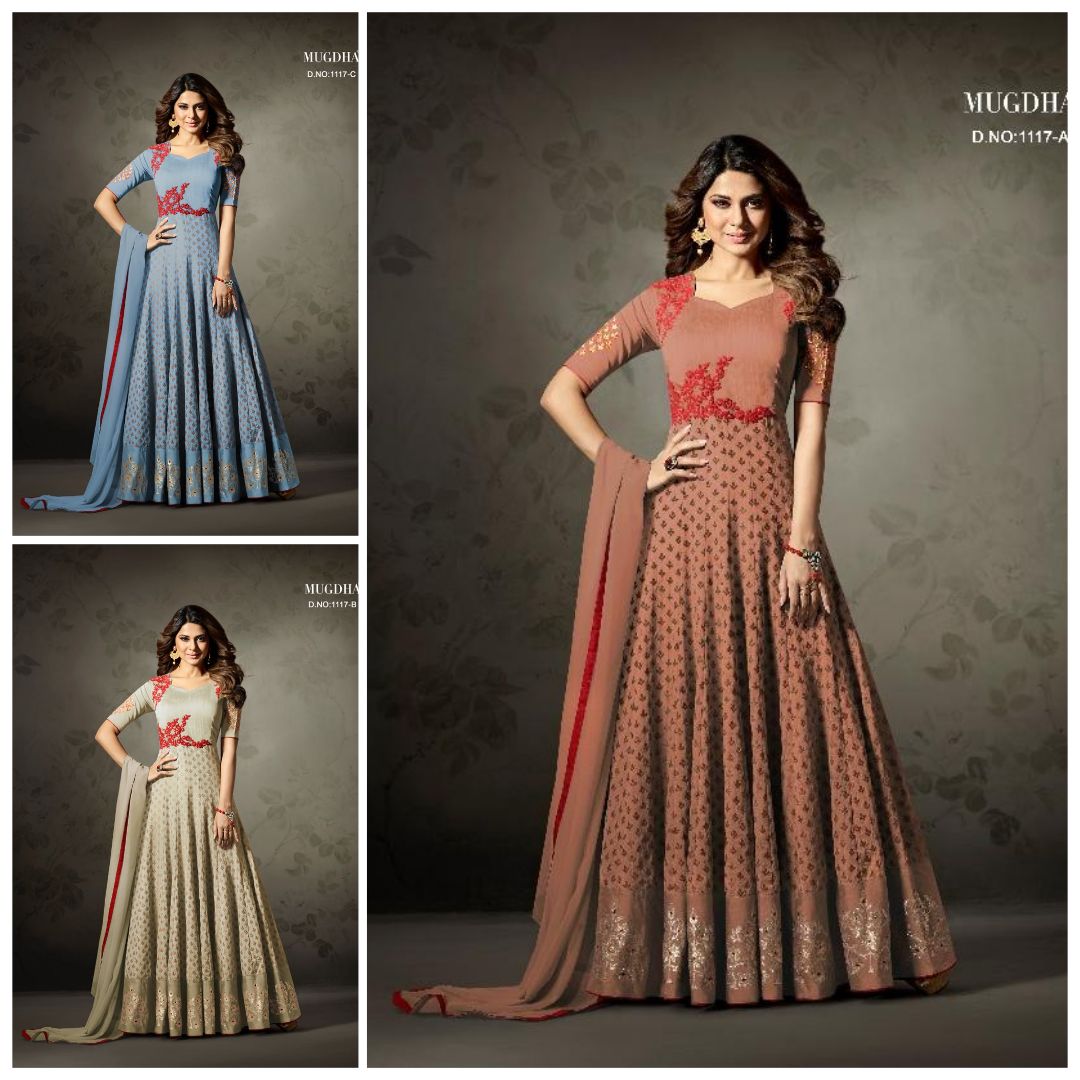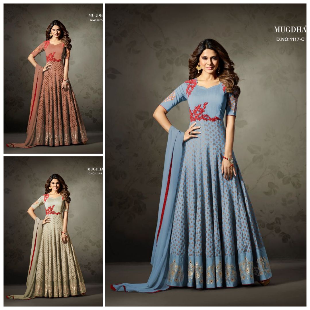 Buy Online Mugdha 1117 Colours Designer Gowns Suit Colection Dealer 3 Pcs of Full Catalogue at Wholesale Price. Looking for Mugdha 1117 Colours Designer Gowns Suit Colection Dealer Full Catalouge at Best Price? Buy Now Mugdha 1117 Colours Designer Gowns Suit Colection Dealer at Wholesale Rate of Rs 7950 with Total 3 Pcs from authroized dealer and supplier of MUGDHA Brand. Cost of Each piece is just only Rs 2650 which is very low and affordable price to resale the product in your retail store ,This is Surat based Wholesale Supplier & Dealer of MUGDHA Brand. Click on Brand name to Know more about MUGDHA Brand's products.Call or Whatsapp on 9898838984 for booking or enquiry