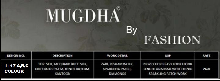 Brand - Mugdha by fashion New colours New Colours Of 1117. GST 5 Percent Extra. Delivery from today . Book your order now . |