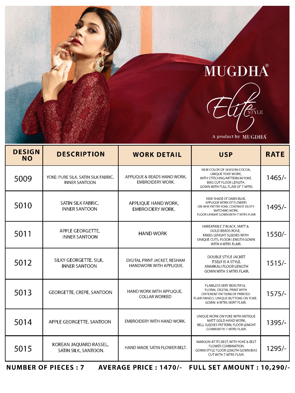 Buy Online Mugdha Fashion Presents Elite Style Fancy Pattern Party Wear Gown Wholesale Dealer And Supplier Surat 7 Pcs of Full Catalogue at Wholesale Price. Looking for Mugdha Fashion Presents Elite Style Fancy Pattern Party Wear Gown Wholesale Dealer And Supplier Surat Full Catalouge at Best Price? Buy Now Mugdha Fashion Presents Elite Style Fancy Pattern Party Wear Gown Wholesale Dealer And Supplier Surat at Wholesale Rate of Rs 10290 with Total 7 Pcs from authroized dealer and supplier of MUGDHA Brand. Cost of Each piece is just only Rs 1470 which is very low and affordable price to resale the product in your retail store ,This is Surat based Wholesale Supplier & Dealer of MUGDHA Brand. Click on Brand name to Know more about MUGDHA Brand's products.Call or Whatsapp on 9898838984 for booking or enquiry