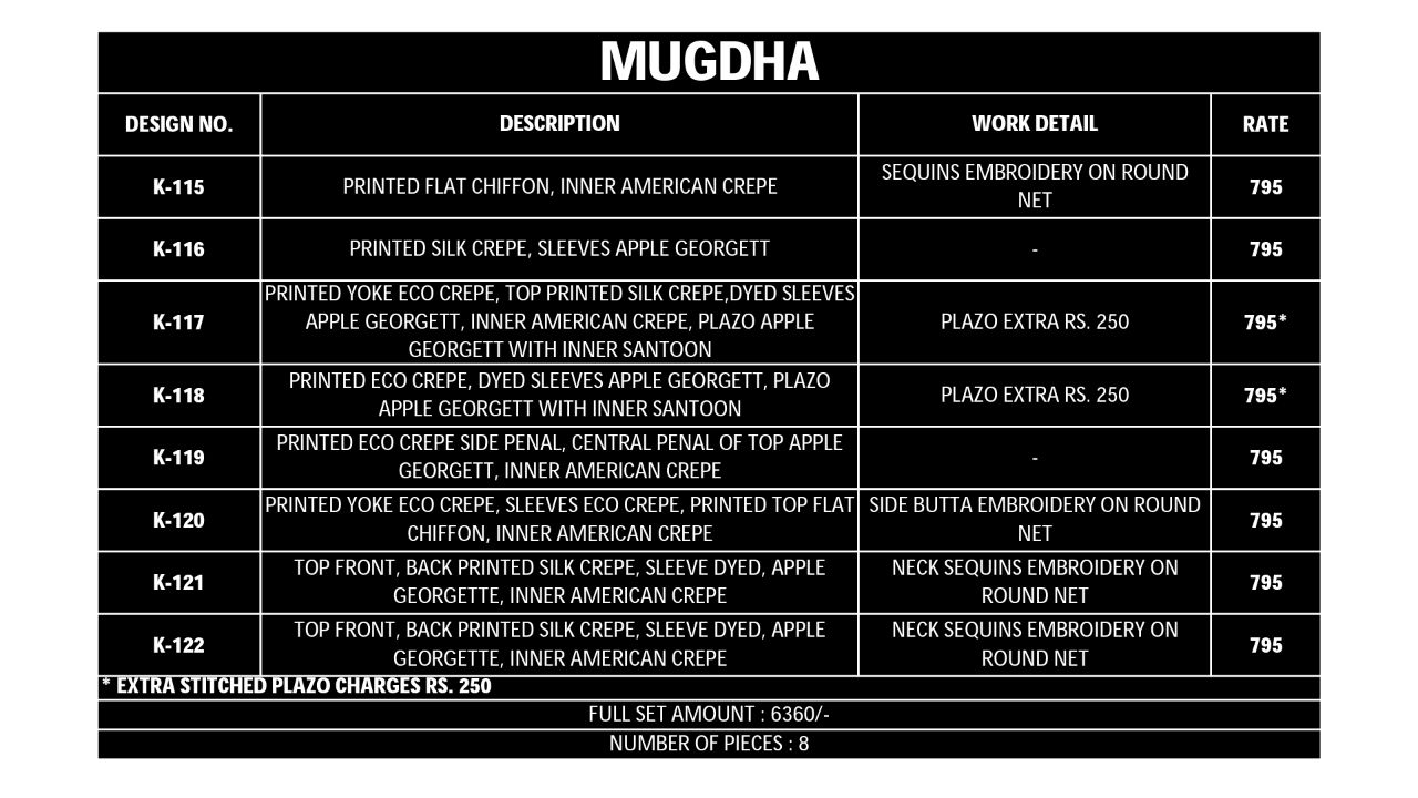 Buy Online Mugdha K 115 Series Top And Plazzo Collection Wholesaler 8 Pcs of Full Catalogue at Wholesale Price. Looking for Mugdha K 115 Series Top And Plazzo Collection Wholesaler Full Catalouge at Best Price? Buy Now Mugdha K 115 Series Top And Plazzo Collection Wholesaler at Wholesale Rate of Rs 6360 with Total 8 Pcs from authroized dealer and supplier of MUGDHA Brand. Cost of Each piece is just only Rs 795 which is very low and affordable price to resale the product in your retail store ,This is Surat based Wholesale Supplier & Dealer of MUGDHA Brand. Click on Brand name to Know more about MUGDHA Brand's products.Call or Whatsapp on 9898838984 for booking or enquiry