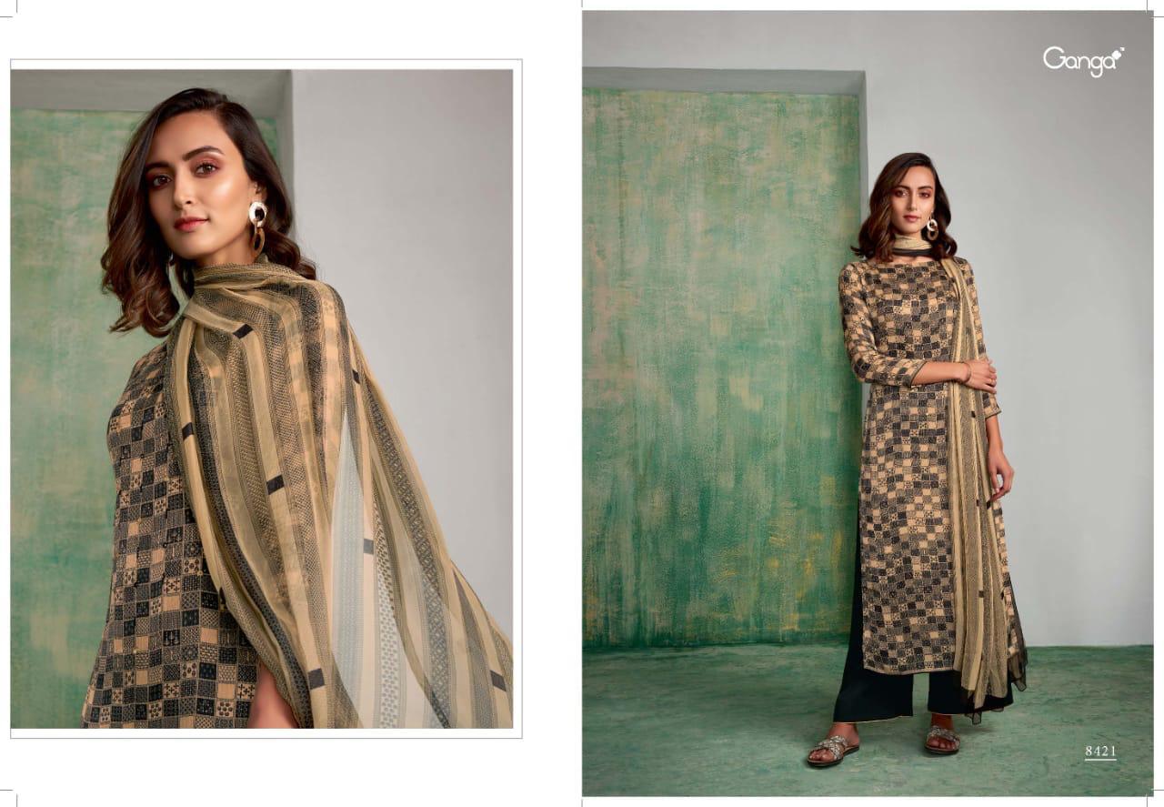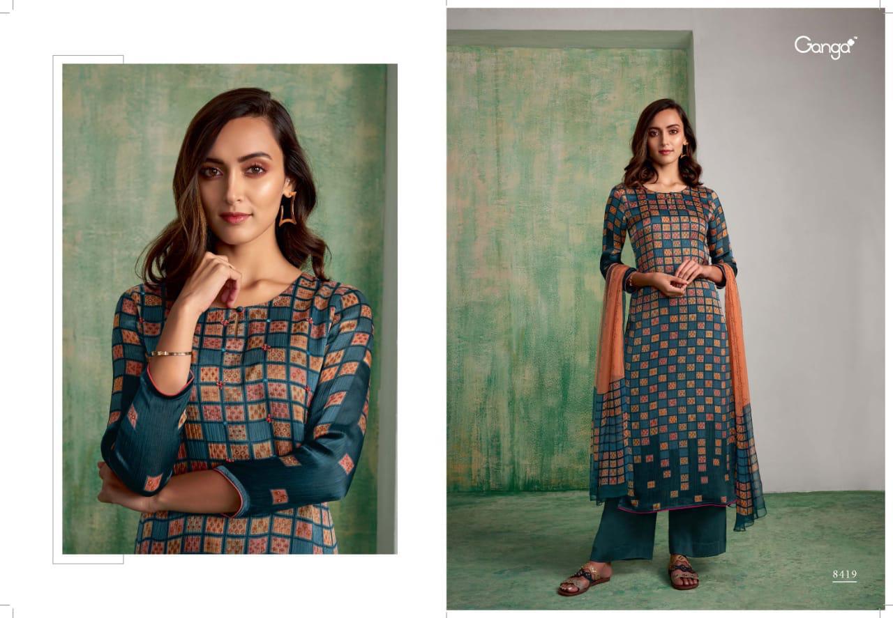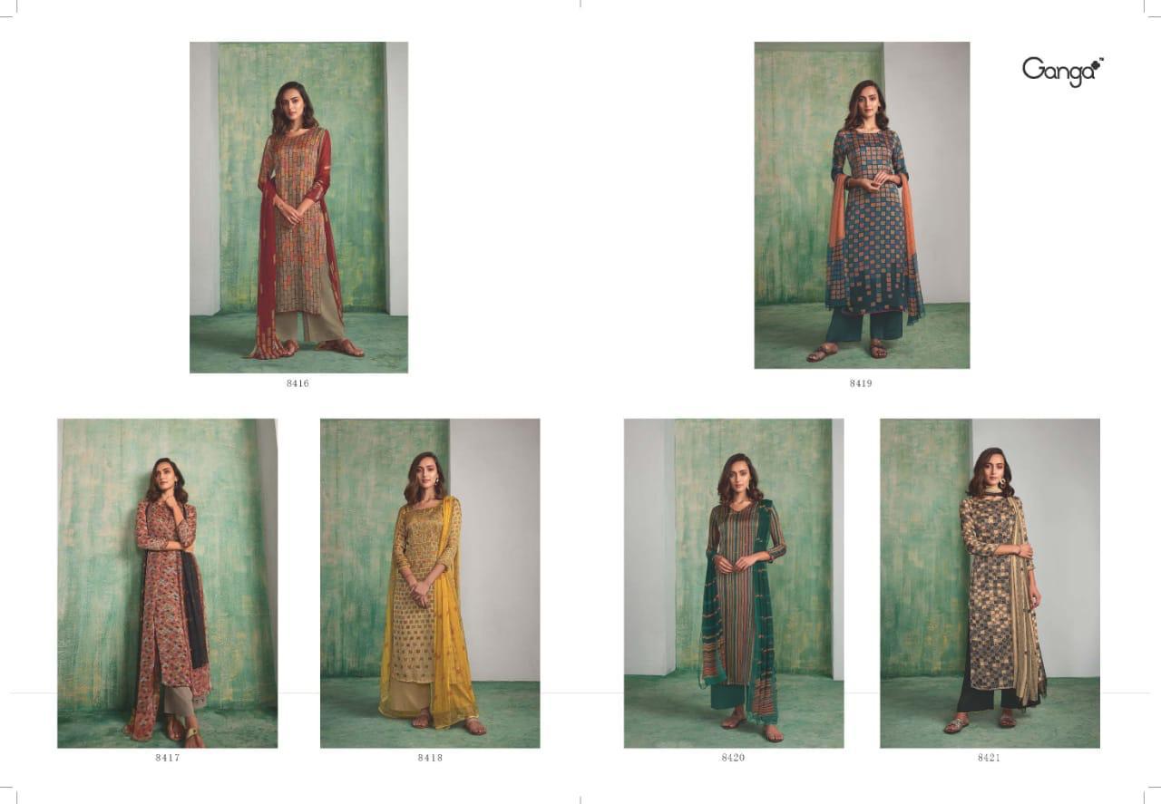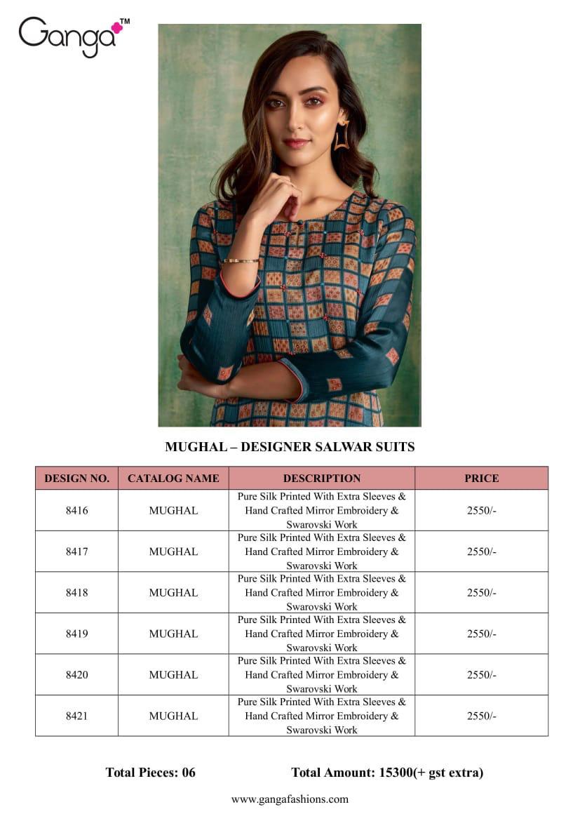 Buy Online Mughal By Ganga Series 8416 Silk Printed Dress Materials Wholesale Supplier Surat 6 Pcs of Full Catalogue at Wholesale Price. Looking for Mughal By Ganga Series 8416 Silk Printed Dress Materials Wholesale Supplier Surat Full Catalouge at Best Price? Buy Now Mughal By Ganga Series 8416 Silk Printed Dress Materials Wholesale Supplier Surat at Wholesale Rate of Rs 15300 with Total 6 Pcs from authroized dealer and supplier of GANGA Brand. Cost of Each piece is just only Rs 2550 which is very low and affordable price to resale the product in your retail store ,This is Surat based Wholesale Supplier & Dealer of GANGA Brand. Click on Brand name to Know more about GANGA Brand's products.Call or Whatsapp on 9898838984 for booking or enquiry