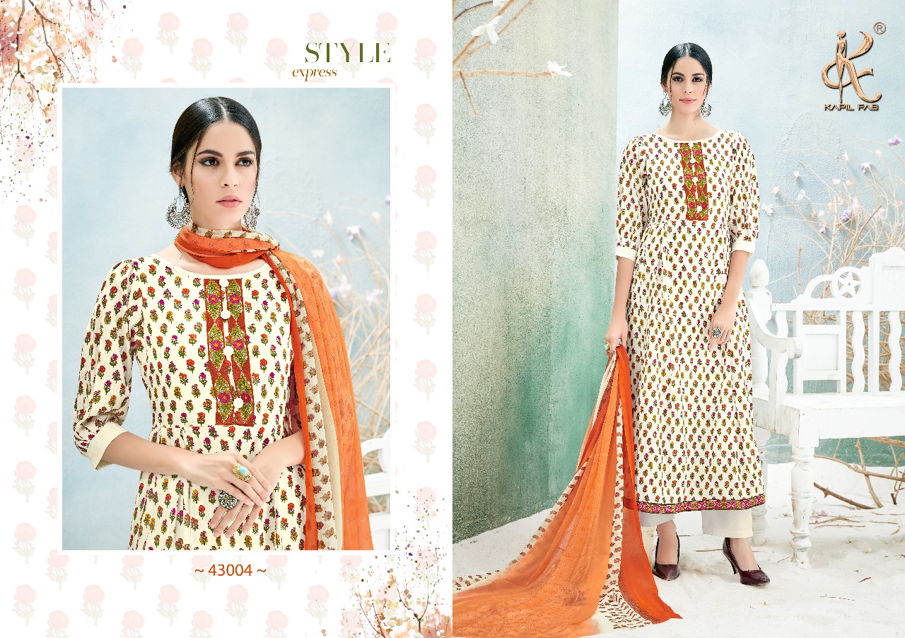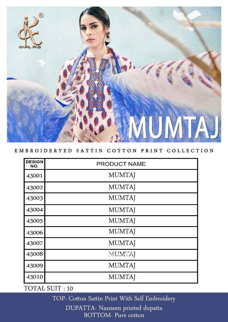 Buy Online Mumtaj By Kapil Fab Satin Cotton With Self Embroidery Suits Wholesale Dealer And Supplier Nitya Nx Surat 10 Pcs of Full Catalogue at Wholesale Price. Looking for Mumtaj By Kapil Fab Satin Cotton With Self Embroidery Suits Wholesale Dealer And Supplier Nitya Nx Surat Full Catalouge at Best Price? Buy Now Mumtaj By Kapil Fab Satin Cotton With Self Embroidery Suits Wholesale Dealer And Supplier Nitya Nx Surat at Wholesale Rate of Rs 5510 with Total 10 Pcs from authroized dealer and supplier of KAPIL TRENDZ Brand. Cost of Each piece is just only Rs 551 which is very low and affordable price to resale the product in your retail store ,This is Surat based Wholesale Supplier & Dealer of KAPIL TRENDZ Brand. Click on Brand name to Know more about KAPIL TRENDZ Brand's products.Call or Whatsapp on 9898838984 for booking or enquiry