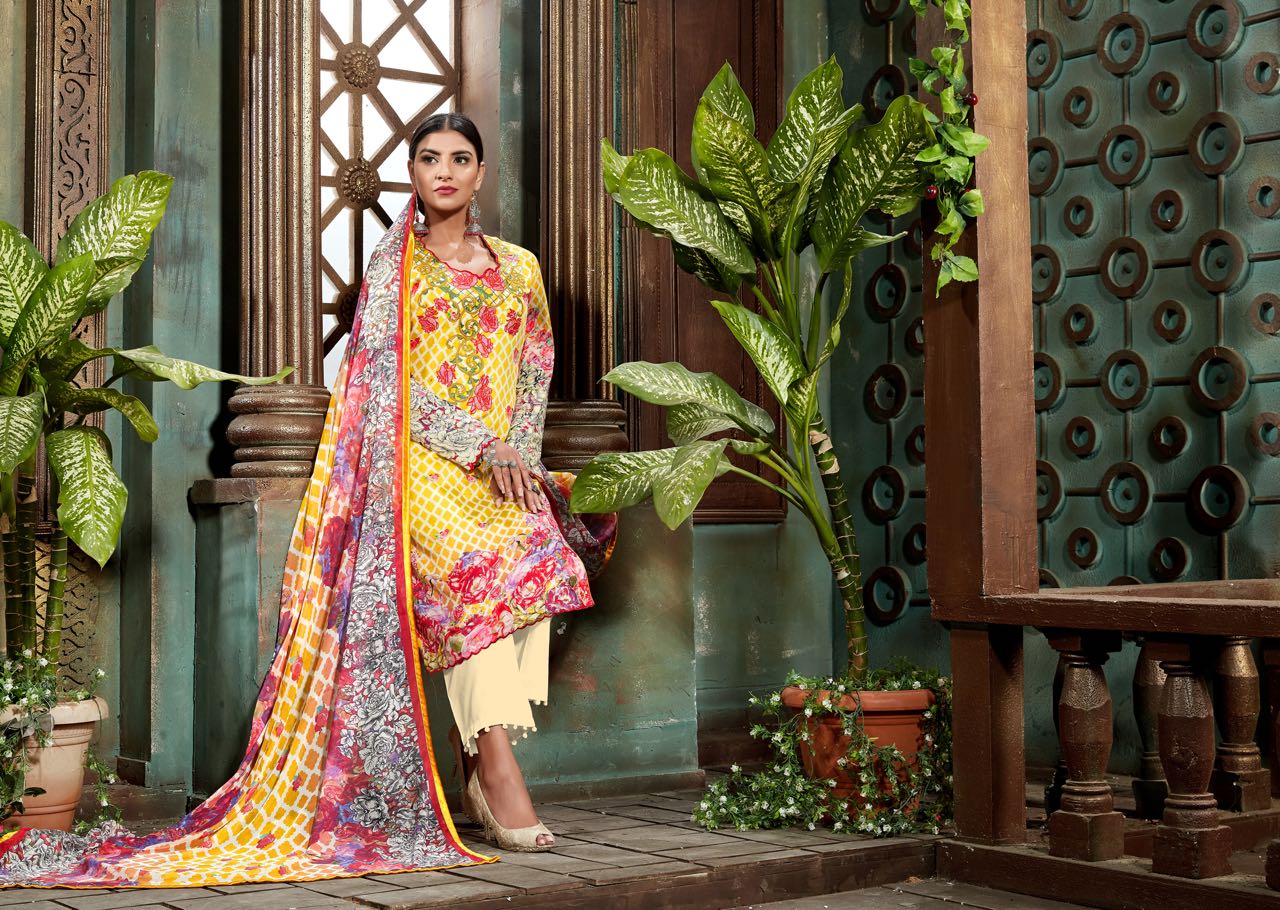 Thank you for your support Today we MUMTAZ ARTSÂ? RANGON KI DUNIYAÂ? are launching our all time exclusive series with 100% Pure jam satin top with self embroidery on top WITH 100% LIGHT WEIGHT JAM SATIN DUP WITH BOX PALLU MUMTAZ ARTS RANGON KI DUNYA Name - GULMOHAR THE ORIGINAL LAWN JAM SILK COLLECTION KARACHI SUITS Fabric details - Top - Pure JAM SATIN Print With Self embroidery Bot - Pure cotton dyed (2.80 mtr app) Dup - LIGHT WEIGHT JAM SATIN DUP WITH Designs - 10 pcs Selling Rate - 675/- +5%GST SELF EMBROIDERY ON TOP |