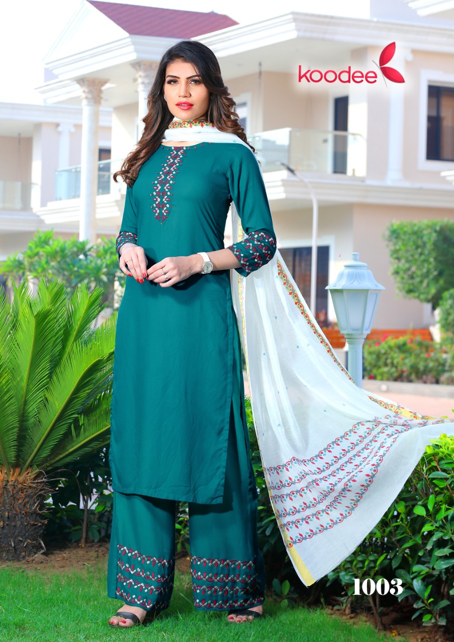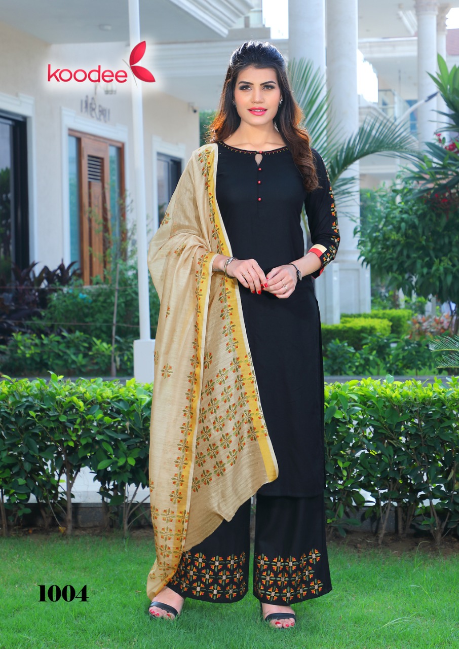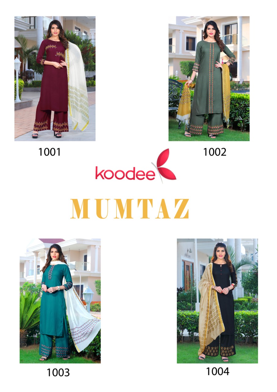 Buy Online Mumtaz By Koodee Reyon Kurtis With Plazzo Wholesale Supplier Surat 4 Pcs of Full Catalogue at Wholesale Price. Looking for Mumtaz By Koodee Reyon Kurtis With Plazzo Wholesale Supplier Surat Full Catalouge at Best Price? Buy Now Mumtaz By Koodee Reyon Kurtis With Plazzo Wholesale Supplier Surat at Wholesale Rate of Rs 3400 with Total 4 Pcs from authroized dealer and supplier of Brand. Cost of Each piece is just only Rs 850 which is very low and affordable price to resale the product in your retail store ,This is Surat based Wholesale Supplier & Dealer of Brand. Click on Brand name to Know more about Brand's products.Call or Whatsapp on 9898838984 for booking or enquiry