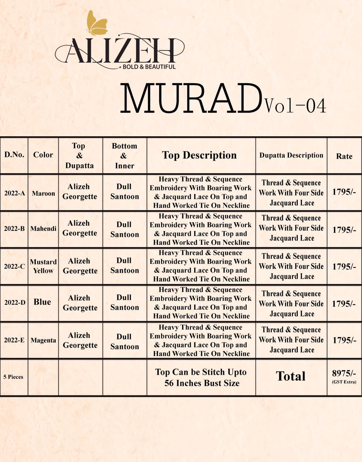Buy Online Murad Vol 4 By Alizeh Official Single And Set Stockiest And Supplier From Surat 5 Pcs of Full Catalogue at Wholesale Price. Looking for Murad Vol 4 By Alizeh Official Single And Set Stockiest And Supplier From Surat Full Catalouge at Best Price? Buy Now Murad Vol 4 By Alizeh Official Single And Set Stockiest And Supplier From Surat at Wholesale Rate of Rs 8975 with Total 5 Pcs from authroized dealer and supplier of Brand. Cost of Each piece is just only Rs 1795 which is very low and affordable price to resale the product in your retail store ,This is Surat based Wholesale Supplier & Dealer of Brand. Click on Brand name to Know more about Brand's products.Call or Whatsapp on 9898838984 for booking or enquiry
