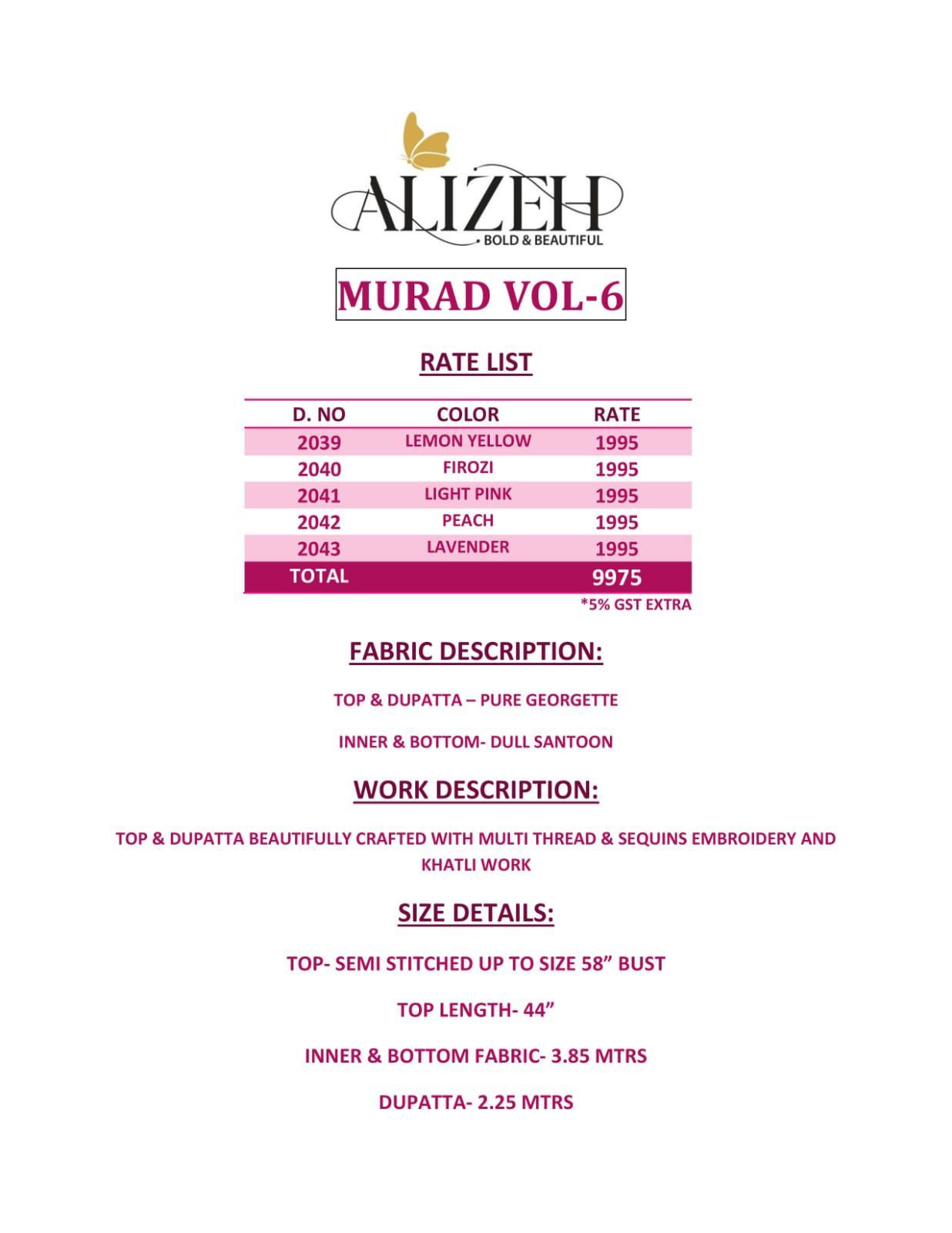 Buy Online Murad Vol 6 By Alizeh Official Designer Suits Single And Set Stockiest And Supplier From Surat 5 Pcs of Full Catalogue at Wholesale Price. Looking for Murad Vol 6 By Alizeh Official Designer Suits Single And Set Stockiest And Supplier From Surat Full Catalouge at Best Price? Buy Now Murad Vol 6 By Alizeh Official Designer Suits Single And Set Stockiest And Supplier From Surat at Wholesale Rate of Rs 9975 with Total 5 Pcs from authroized dealer and supplier of Brand. Cost of Each piece is just only Rs 1995 which is very low and affordable price to resale the product in your retail store ,This is Surat based Wholesale Supplier & Dealer of Brand. Click on Brand name to Know more about Brand's products.Call or Whatsapp on 9898838984 for booking or enquiry