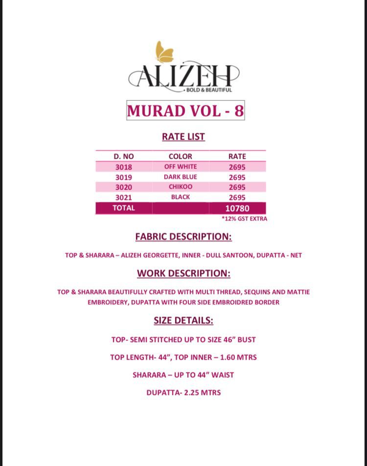 Buy Online Murad Vol 8 By Alizeh Official Designer Suits Single Available Wholesaler Surat Gujarat India 4 Pcs of Full Catalogue at Wholesale Price. Looking for Murad Vol 8 By Alizeh Official Designer Suits Single Available Wholesaler Surat Gujarat India Full Catalouge at Best Price? Buy Now Murad Vol 8 By Alizeh Official Designer Suits Single Available Wholesaler Surat Gujarat India at Wholesale Rate of Rs 10780 with Total 4 Pcs from authroized dealer and supplier of Brand. Cost of Each piece is just only Rs 2695 which is very low and affordable price to resale the product in your retail store ,This is Surat based Wholesale Supplier & Dealer of Brand. Click on Brand name to Know more about Brand's products.Call or Whatsapp on 9898838984 for booking or enquiry
