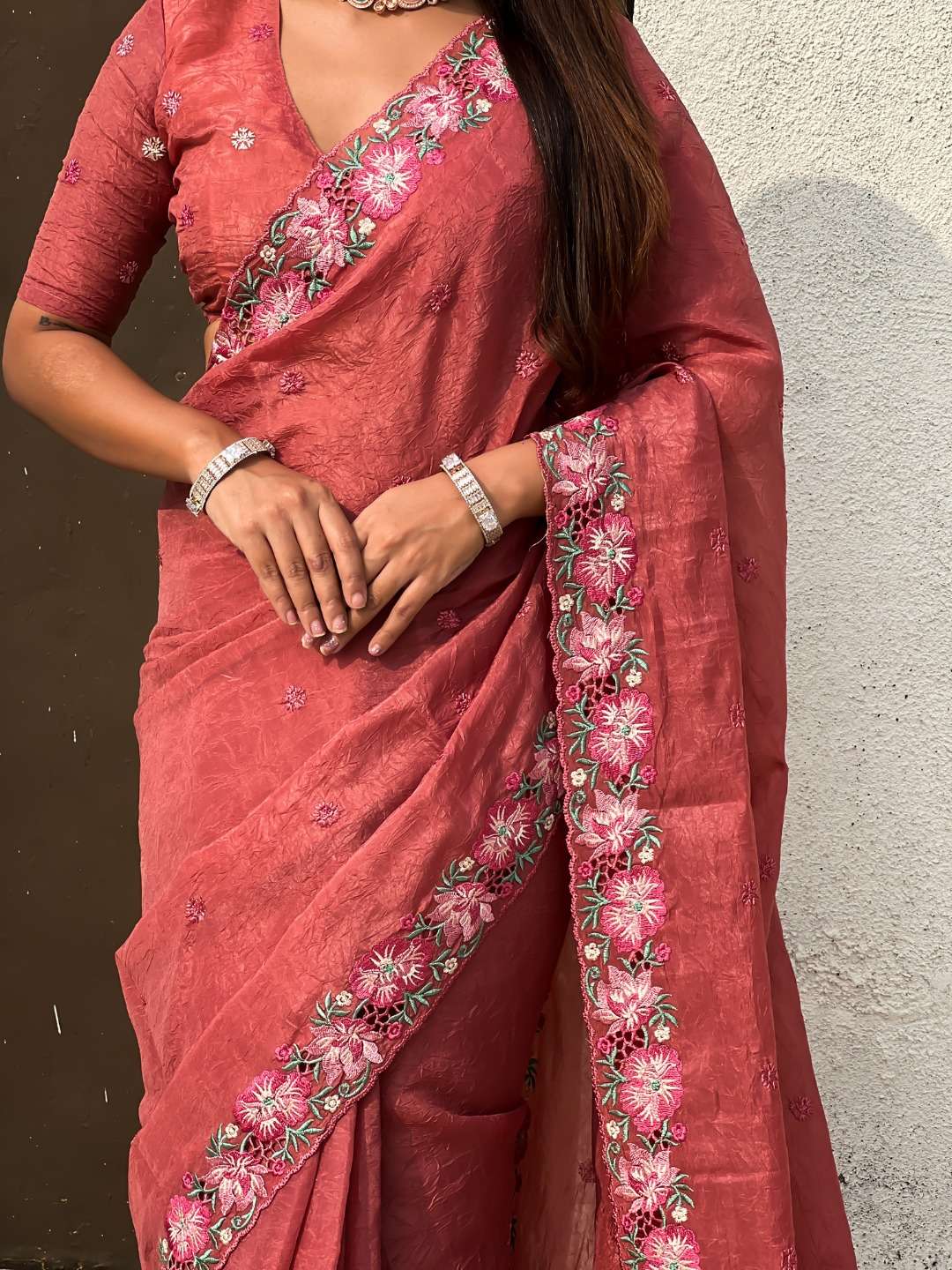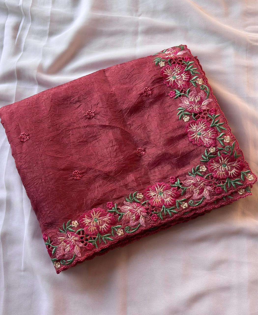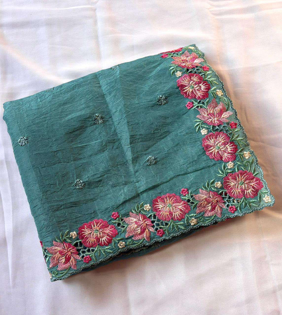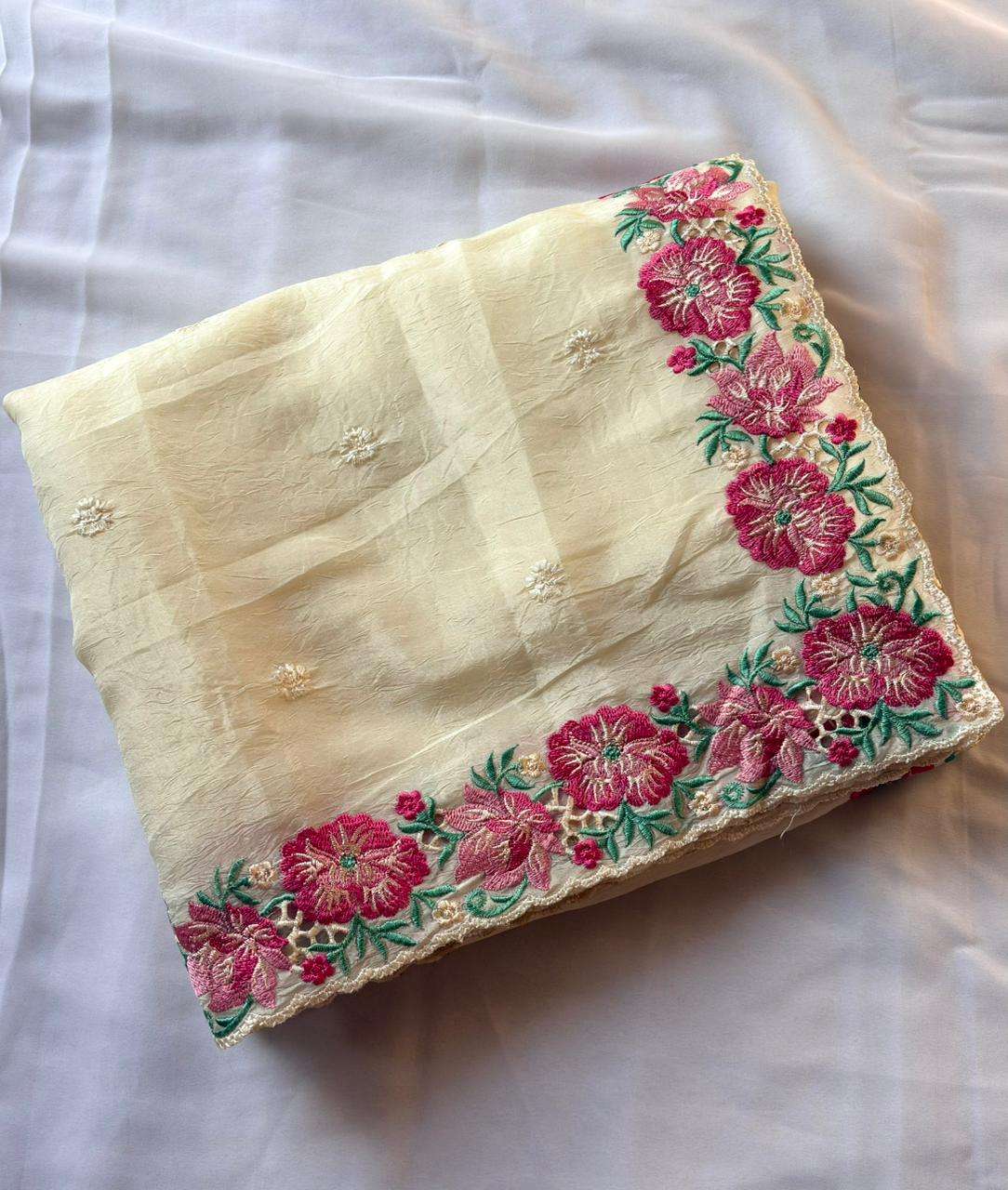 Pure Crush sarees with flower embroidered all over the body, having embroidered multicolor floral motifs with cutwork border.