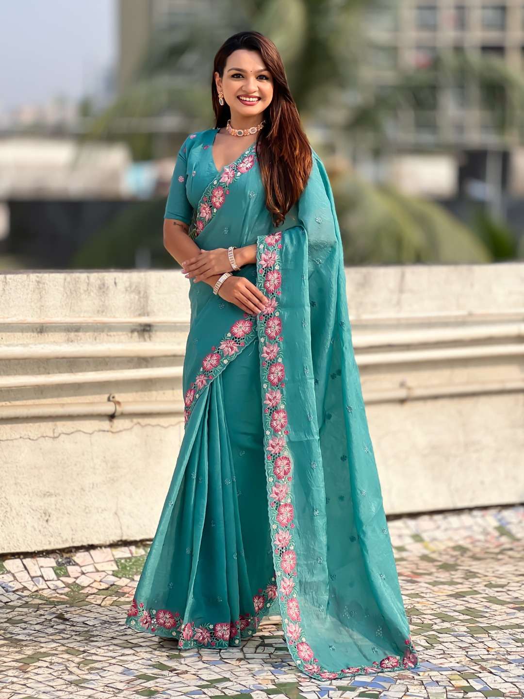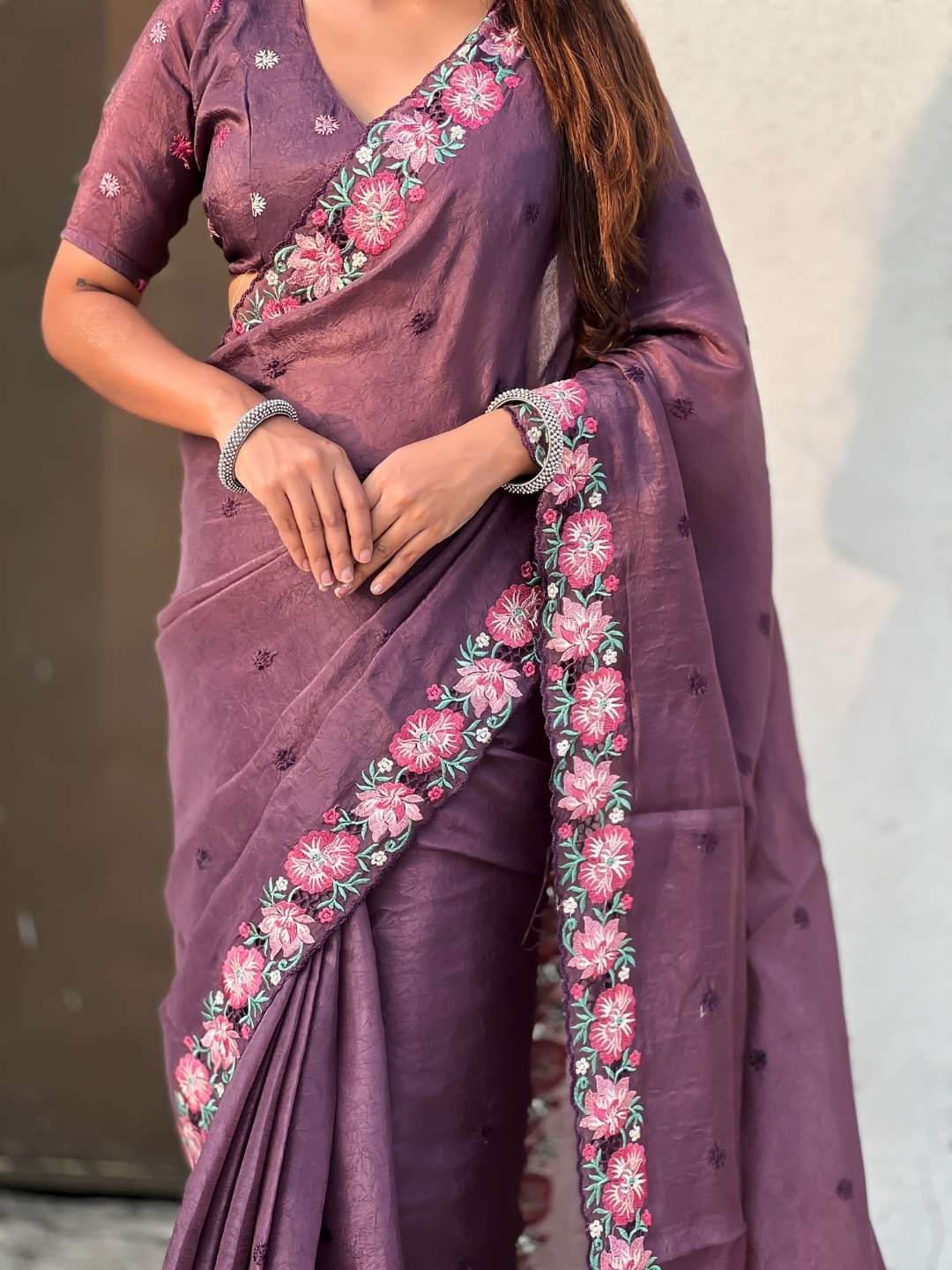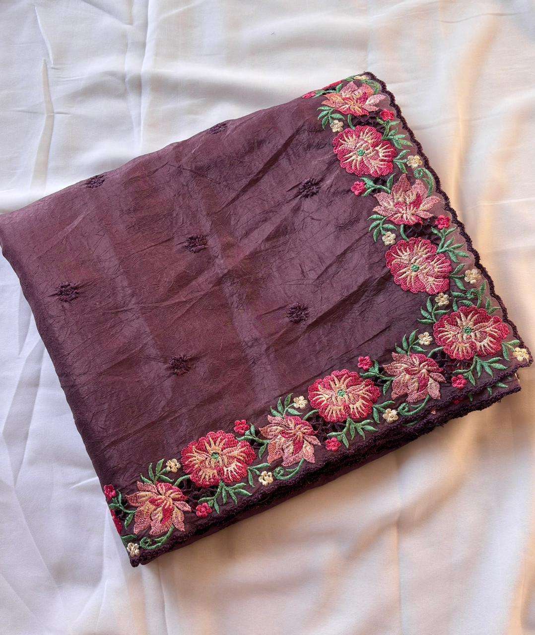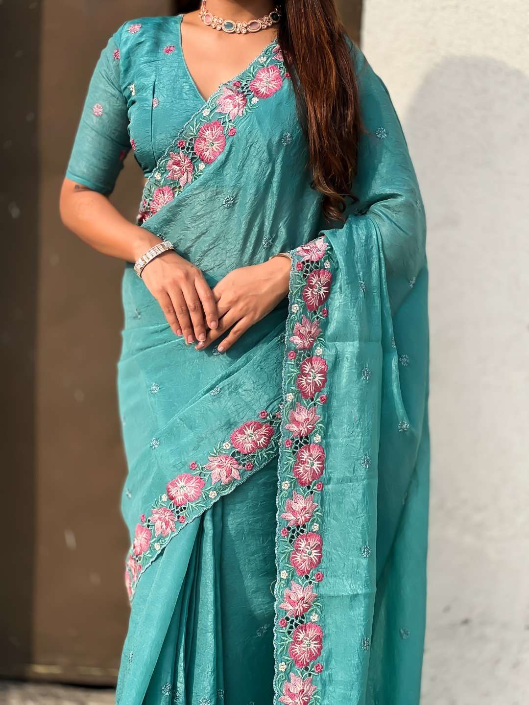 Pure Crush sarees with flower embroidered all over the body, having embroidered multicolor floral motifs with cutwork border.