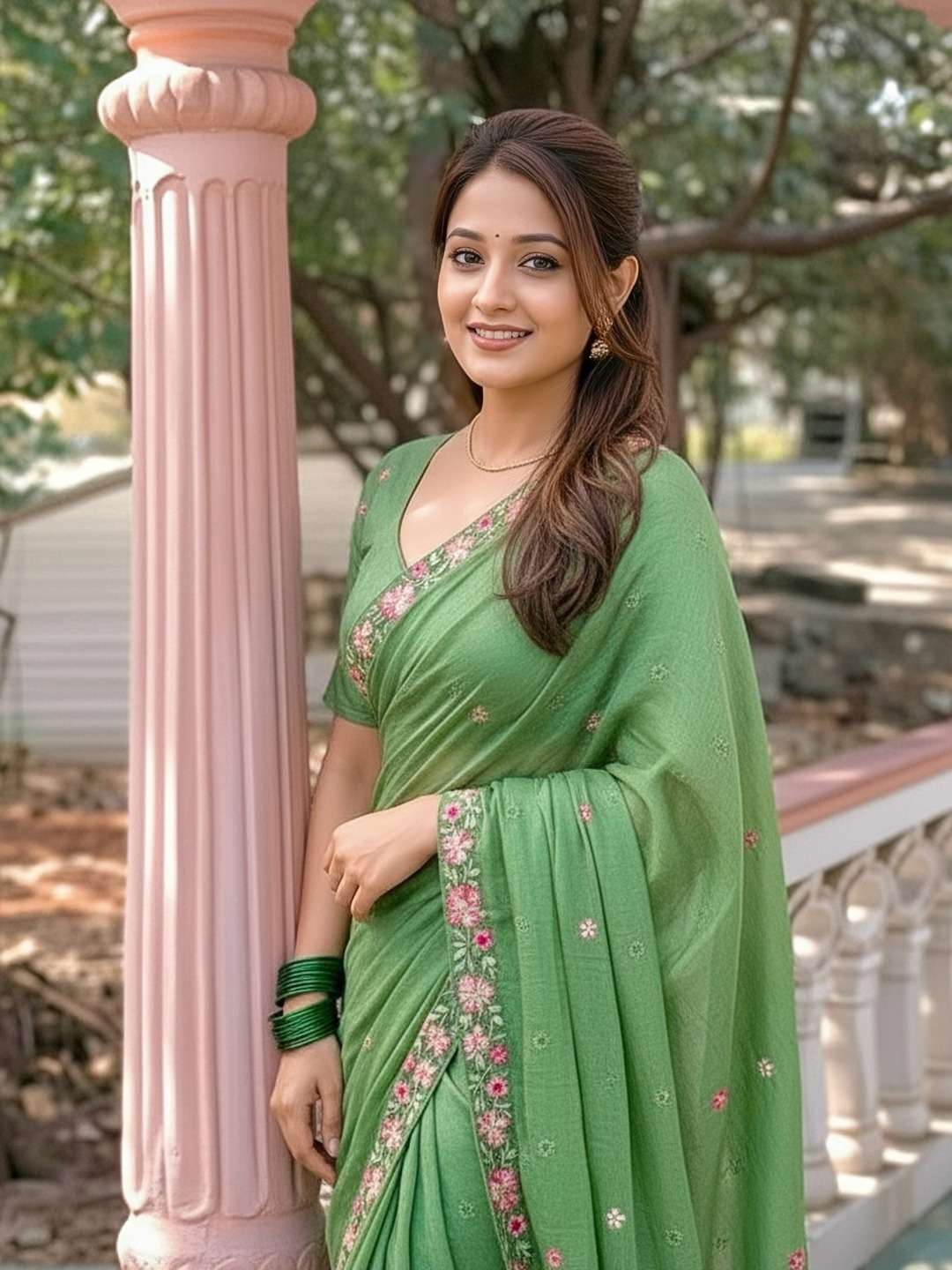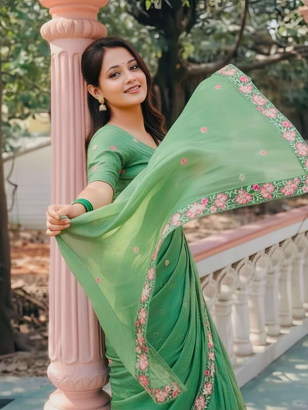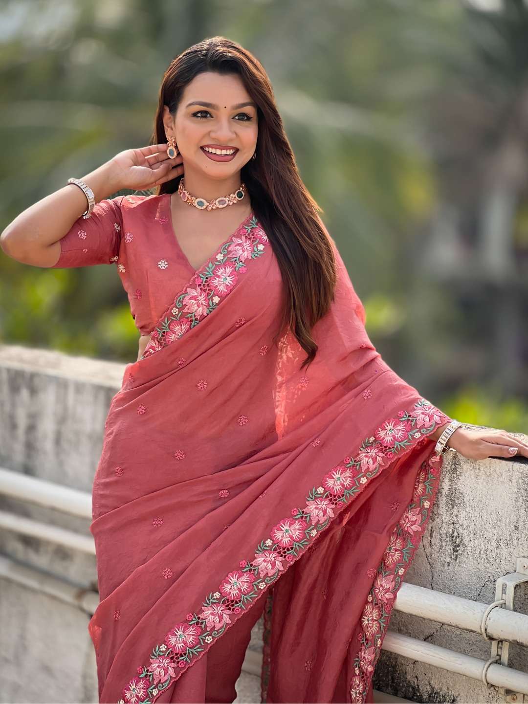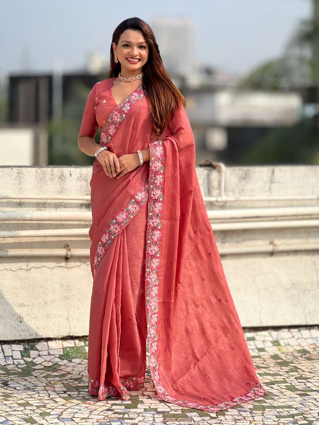 Pure Crush sarees with flower embroidered all over the body, having embroidered multicolor floral motifs with cutwork border.