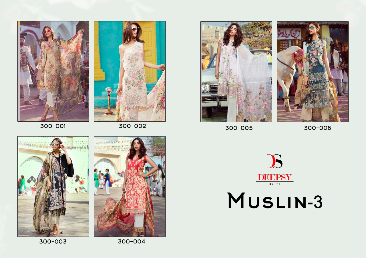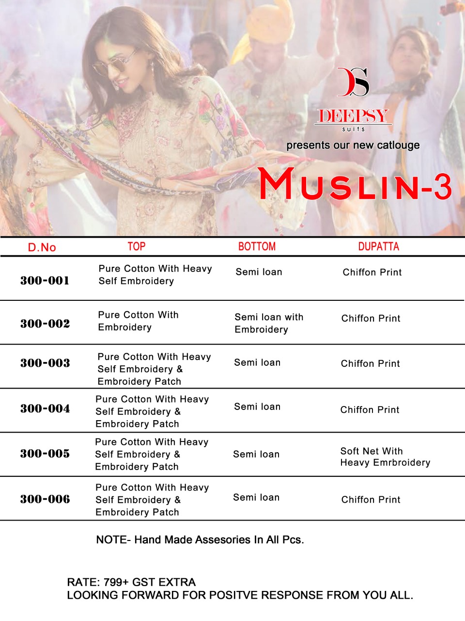 Muslin 3 by deepsy 300001 to 30006 cotton with self embroidery patch designer suits wholesale supplier nd trader surat Price 799+gst Fabric Details attached |