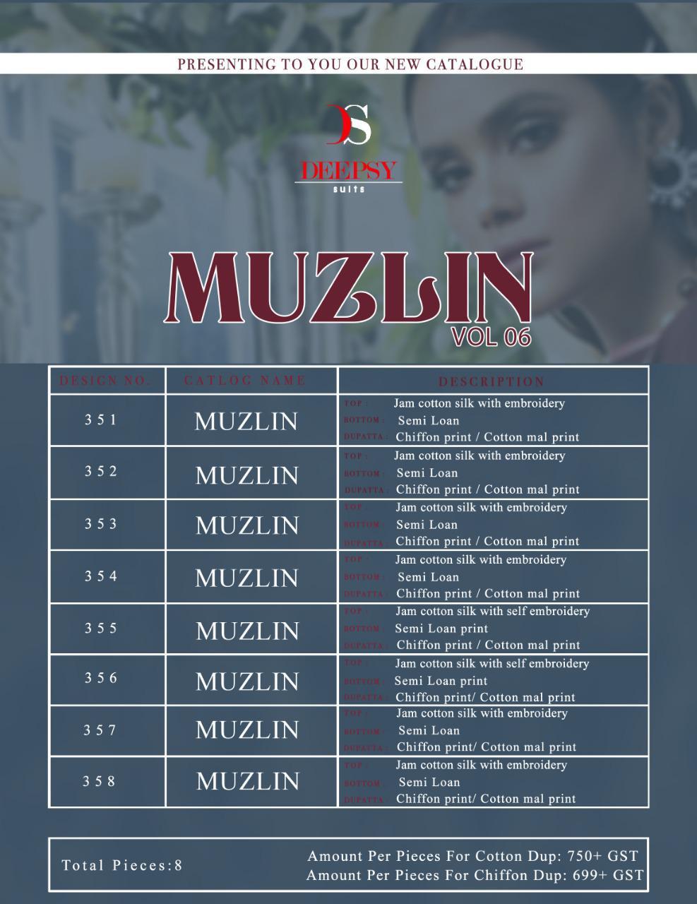 Buy Online Muslin 6 By Deepsy Jam Cotton Dress Materials Wholesale Supplier Surat 8 Pcs of Full Catalogue at Wholesale Price. Looking for Muslin 6 By Deepsy Jam Cotton Dress Materials Wholesale Supplier Surat Full Catalouge at Best Price? Buy Now Muslin 6 By Deepsy Jam Cotton Dress Materials Wholesale Supplier Surat at Wholesale Rate of Rs 5592 with Total 8 Pcs from authroized dealer and supplier of DEEPSY Brand. Cost of Each piece is just only Rs 699 which is very low and affordable price to resale the product in your retail store ,This is Surat based Wholesale Supplier & Dealer of DEEPSY Brand. Click on Brand name to Know more about DEEPSY Brand's products.Call or Whatsapp on 9898838984 for booking or enquiry