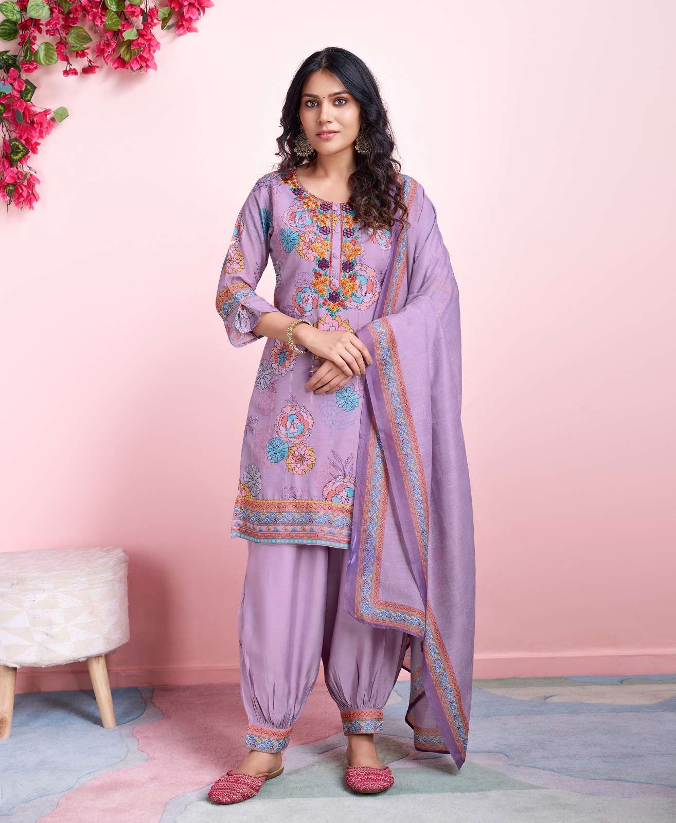 Top : Muslin Silk Floral Embroidered Mirror Kurta Bottom: Viscose Silk Afghani Salwar Dupatta: Muslin Silk Floral Digital Dupatta