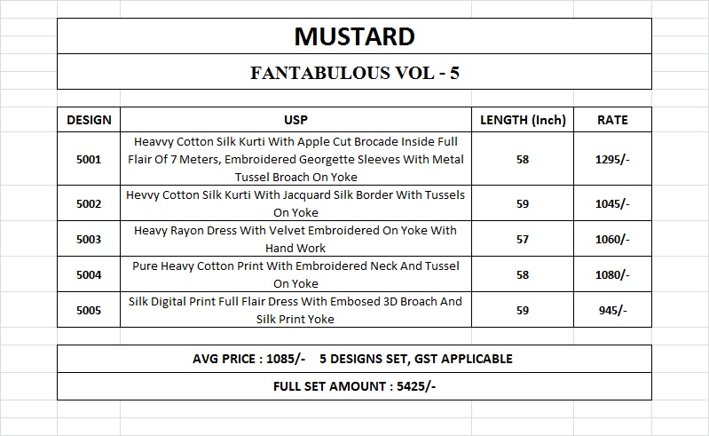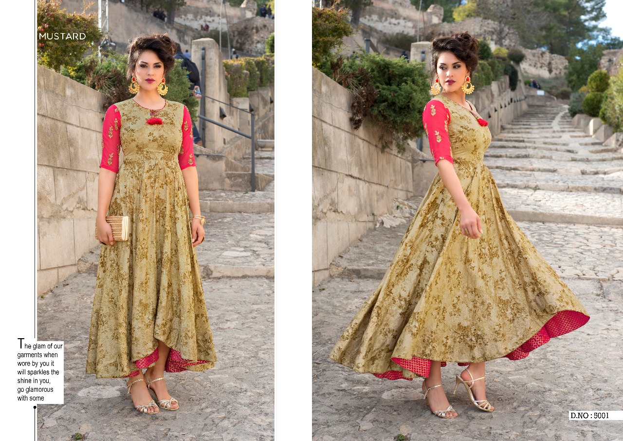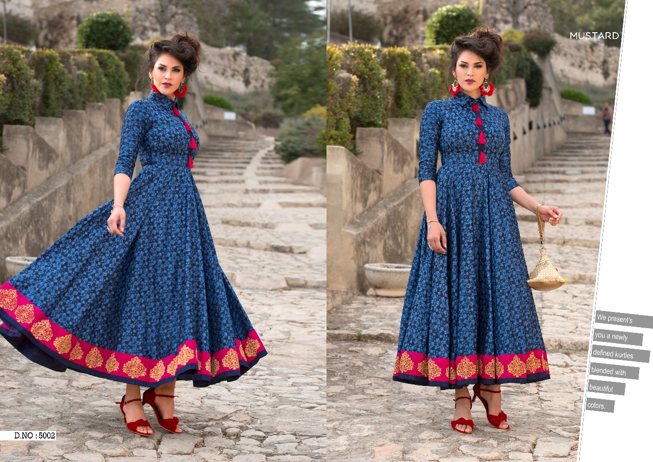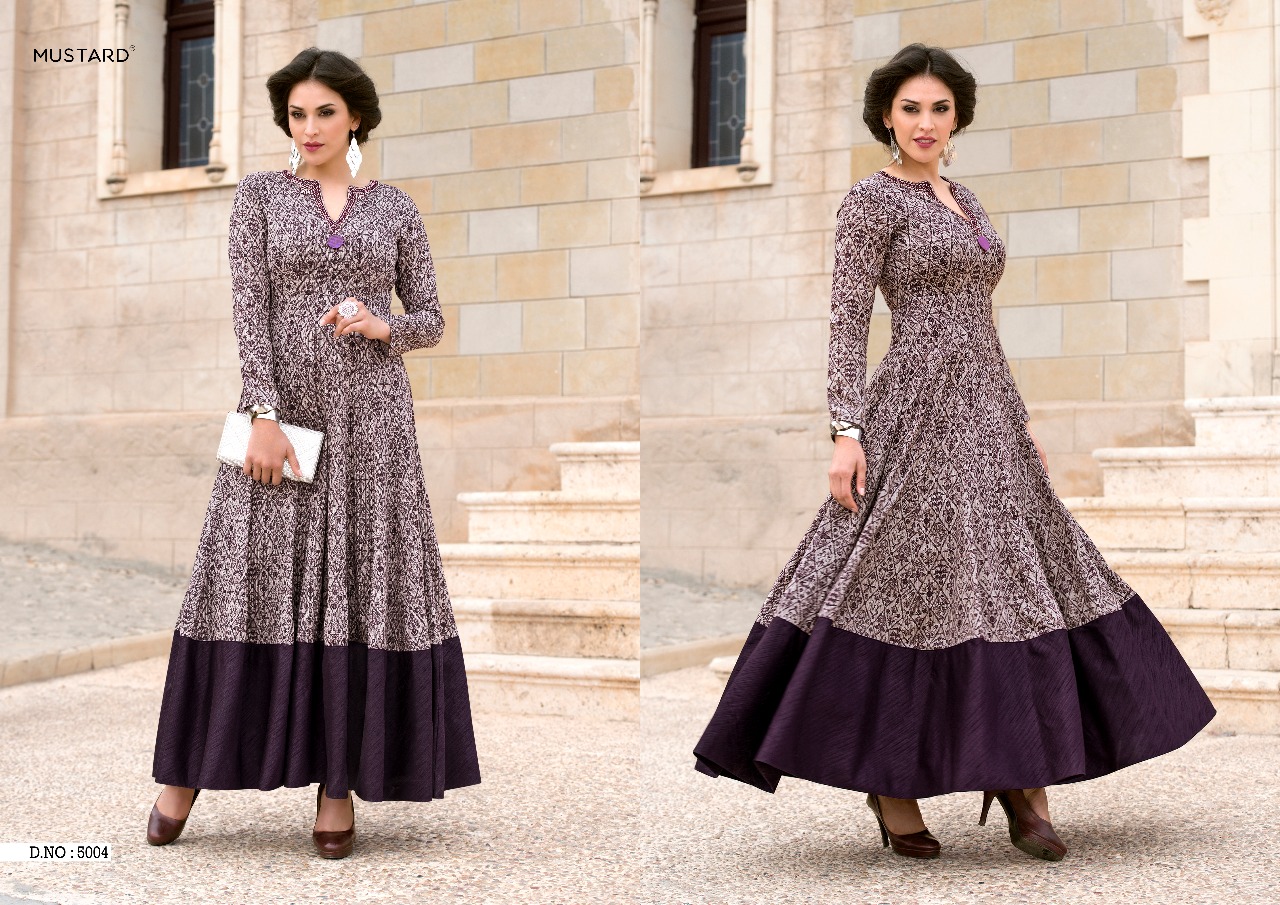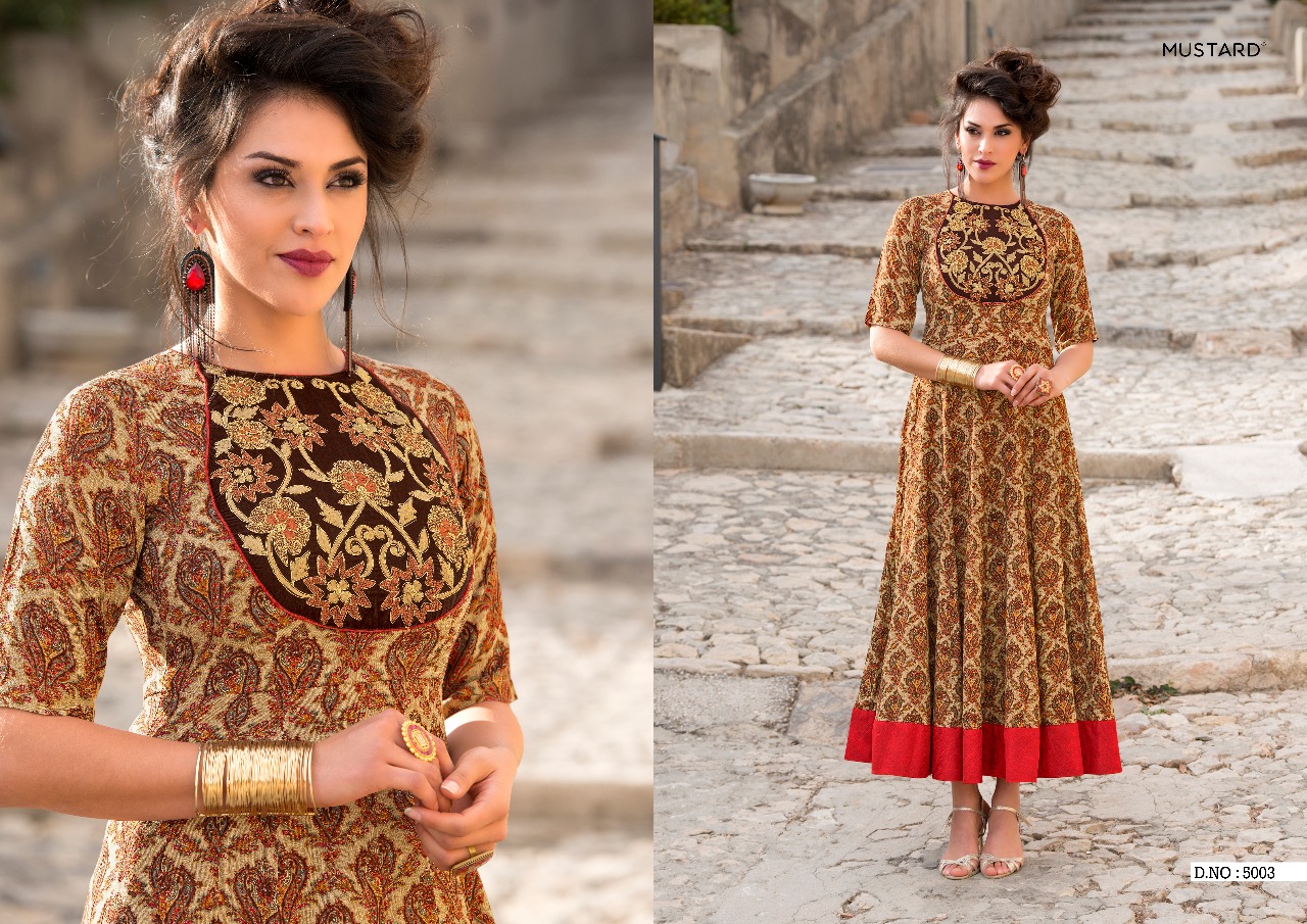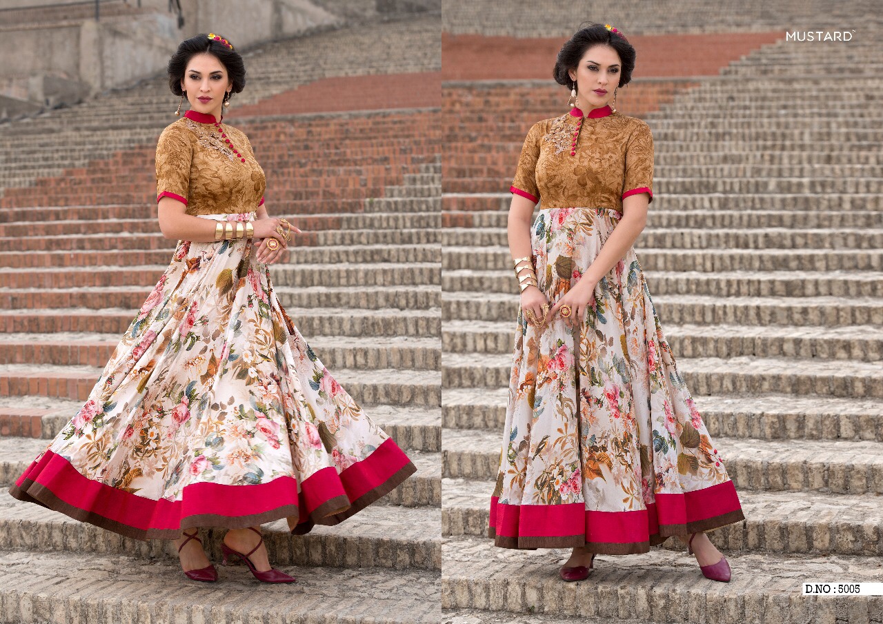 Buy Online Mustard Vol 5 By Mugdha Long Kali Gown Kurties Wholesale Dealer Surat 5 Pcs of Full Catalogue at Wholesale Price. Looking for Mustard Vol 5 By Mugdha Long Kali Gown Kurties Wholesale Dealer Surat Full Catalouge at Best Price? Buy Now Mustard Vol 5 By Mugdha Long Kali Gown Kurties Wholesale Dealer Surat at Wholesale Rate of Rs 5425 with Total 5 Pcs from authroized dealer and supplier of MUGDHA Brand. Cost of Each piece is just only Rs 1085 which is very low and affordable price to resale the product in your retail store ,This is Surat based Wholesale Supplier & Dealer of MUGDHA Brand. Click on Brand name to Know more about MUGDHA Brand's products.Call or Whatsapp on 9898838984 for booking or enquiry
