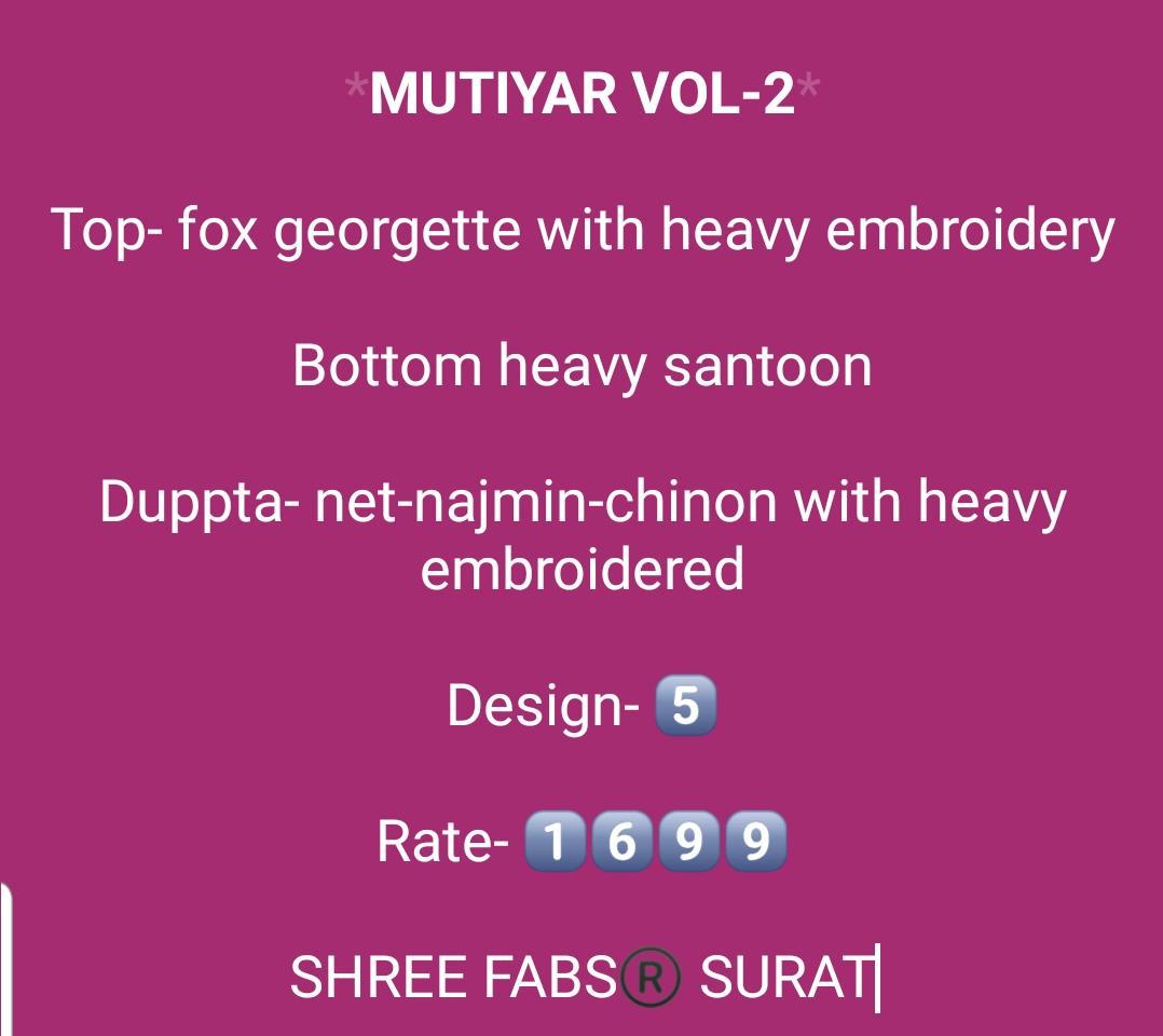 Buy Online Mutiyar Vol 2 By Shree Fabs 2106 Series Fancy Georgette Party Wear Salwar Kameez Catlog Wholesale Dealer Surat 5 Pcs of Full Catalogue at Wholesale Price. Looking for Mutiyar Vol 2 By Shree Fabs 2106 Series Fancy Georgette Party Wear Salwar Kameez Catlog Wholesale Dealer Surat Full Catalouge at Best Price? Buy Now Mutiyar Vol 2 By Shree Fabs 2106 Series Fancy Georgette Party Wear Salwar Kameez Catlog Wholesale Dealer Surat at Wholesale Rate of Rs 8495 with Total 5 Pcs from authroized dealer and supplier of SHREE FABS Brand. Cost of Each piece is just only Rs 1699 which is very low and affordable price to resale the product in your retail store ,This is Surat based Wholesale Supplier & Dealer of SHREE FABS Brand. Click on Brand name to Know more about SHREE FABS Brand's products.Call or Whatsapp on 9898838984 for booking or enquiry