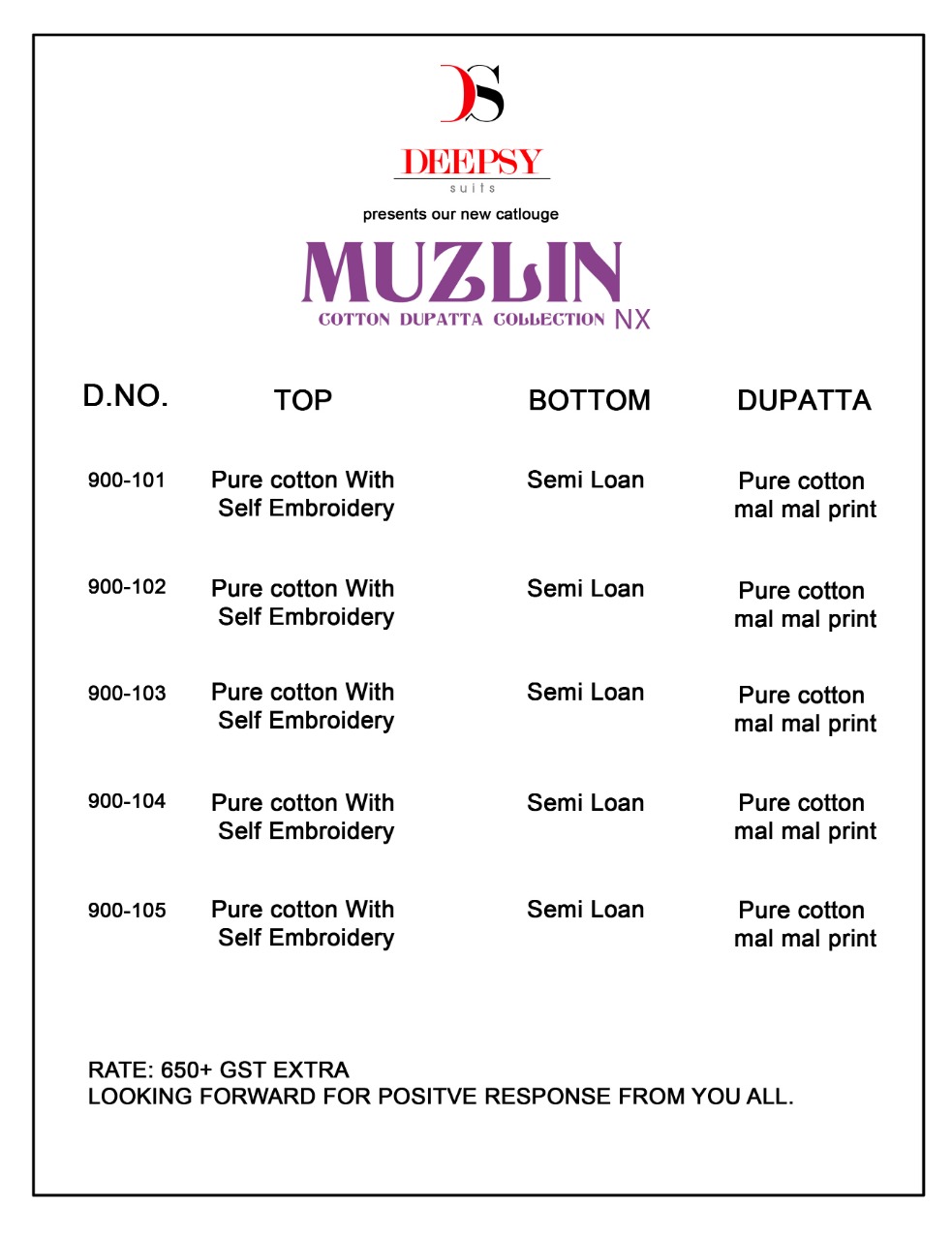 Buy Online Muzlin By Deepsy 900101 Series Fancy Pure Cotton Printed Pakistani Salwar Kameez Catlog 5 Pcs of Full Catalogue at Wholesale Price. Looking for Muzlin By Deepsy 900101 Series Fancy Pure Cotton Printed Pakistani Salwar Kameez Catlog Full Catalouge at Best Price? Buy Now Muzlin By Deepsy 900101 Series Fancy Pure Cotton Printed Pakistani Salwar Kameez Catlog at Wholesale Rate of Rs 3250 with Total 5 Pcs from authroized dealer and supplier of DEEPSY Brand. Cost of Each piece is just only Rs 650 which is very low and affordable price to resale the product in your retail store ,This is Surat based Wholesale Supplier & Dealer of DEEPSY Brand. Click on Brand name to Know more about DEEPSY Brand's products.Call or Whatsapp on 9898838984 for booking or enquiry