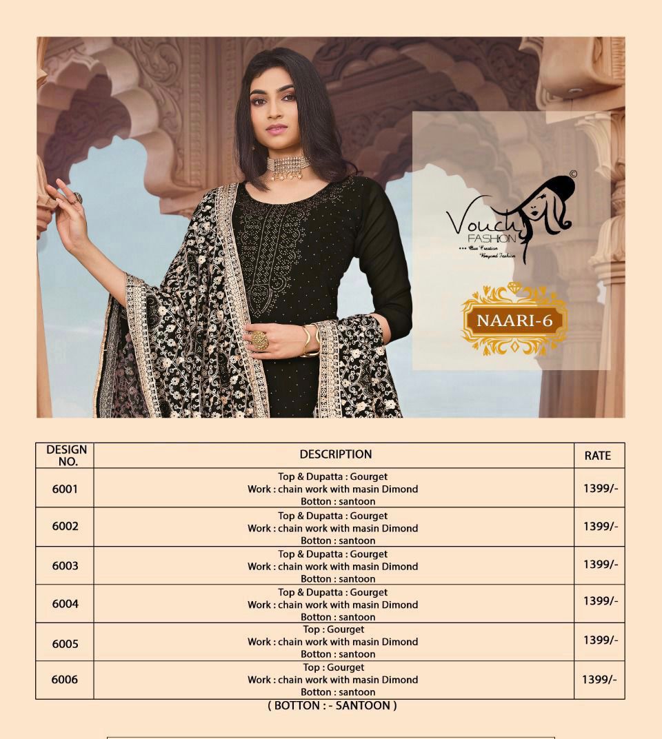 Buy Online Naari Vol 6 By Vouch Fashion Single And Set Stockiest And Supplier From Surat 6 Pcs of Full Catalogue at Wholesale Price. Looking for Naari Vol 6 By Vouch Fashion Single And Set Stockiest And Supplier From Surat Full Catalouge at Best Price? Buy Now Naari Vol 6 By Vouch Fashion Single And Set Stockiest And Supplier From Surat at Wholesale Rate of Rs 8394 with Total 6 Pcs from authroized dealer and supplier of Brand. Cost of Each piece is just only Rs 1399 which is very low and affordable price to resale the product in your retail store ,This is Surat based Wholesale Supplier & Dealer of Brand. Click on Brand name to Know more about Brand's products.Call or Whatsapp on 9898838984 for booking or enquiry