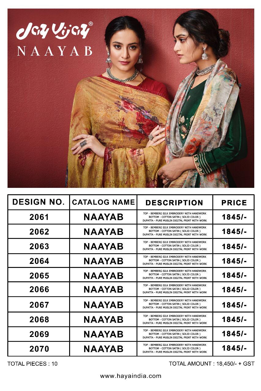 Buy Online Naayab By Jay Vijay Series 2061 Designer Party Wear Suits Wholesale Supplier Gujarat 10 Pcs of Full Catalogue at Wholesale Price. Looking for Naayab By Jay Vijay Series 2061 Designer Party Wear Suits Wholesale Supplier Gujarat Full Catalouge at Best Price? Buy Now Naayab By Jay Vijay Series 2061 Designer Party Wear Suits Wholesale Supplier Gujarat at Wholesale Rate of Rs 18450 with Total 10 Pcs from authroized dealer and supplier of JAY VIJAY Brand. Cost of Each piece is just only Rs 1845 which is very low and affordable price to resale the product in your retail store ,This is Surat based Wholesale Supplier & Dealer of JAY VIJAY Brand. Click on Brand name to Know more about JAY VIJAY Brand's products.Call or Whatsapp on 9898838984 for booking or enquiry