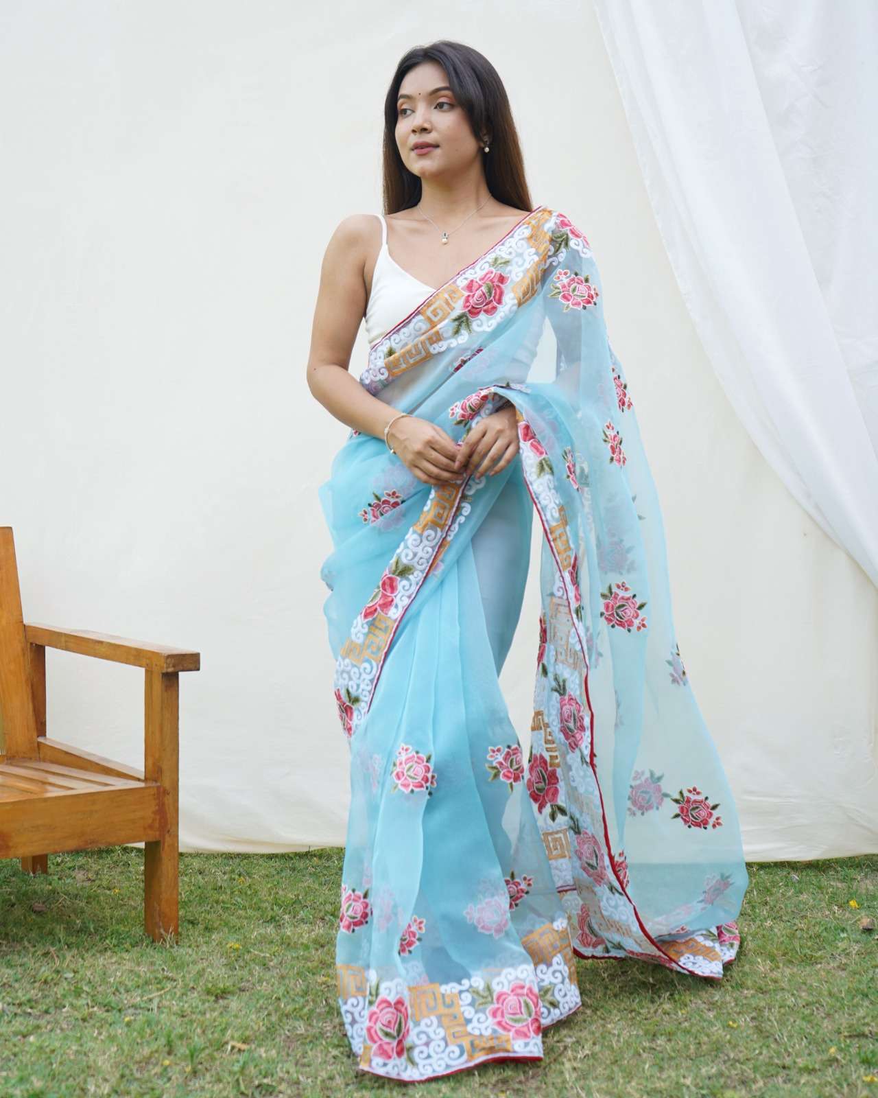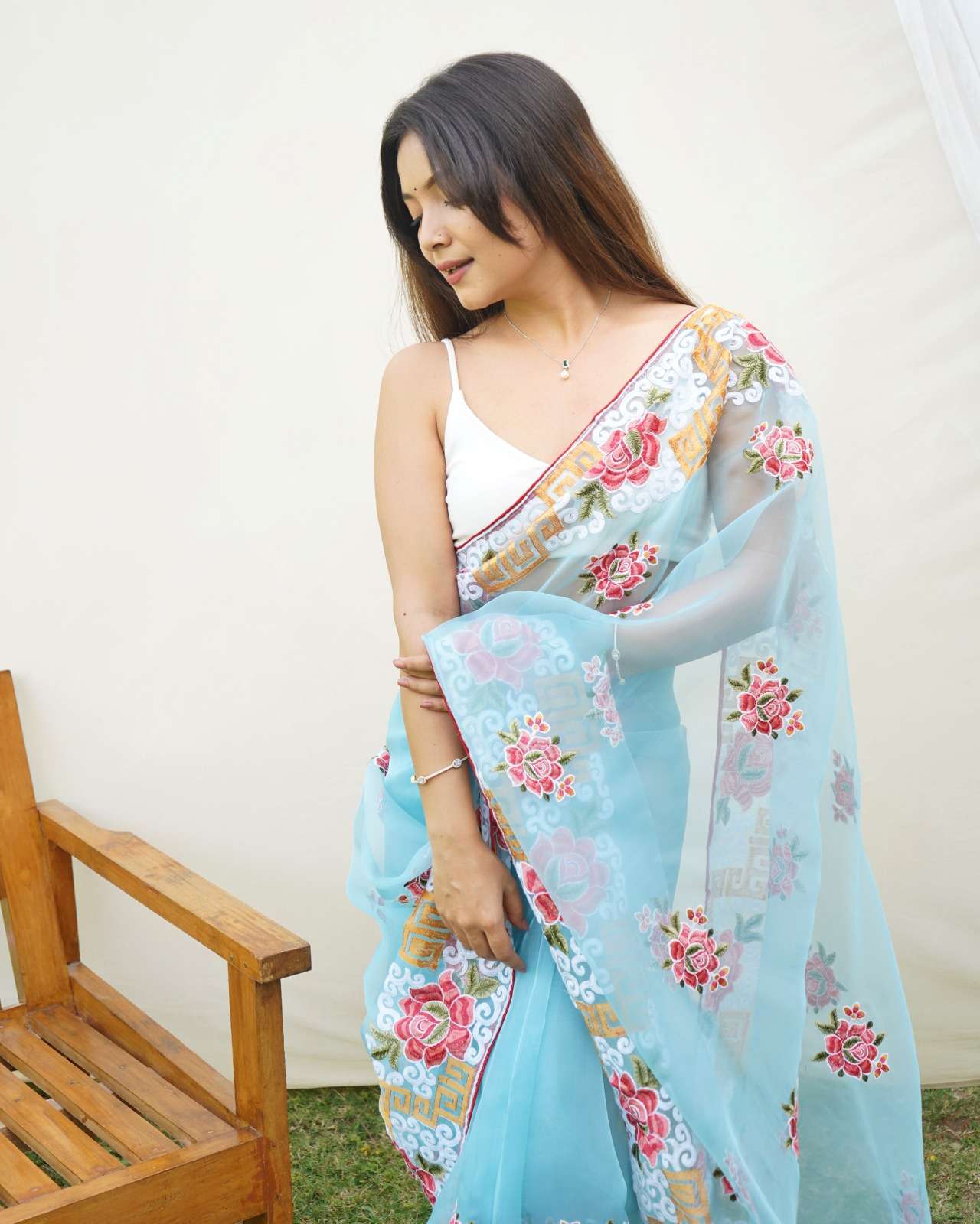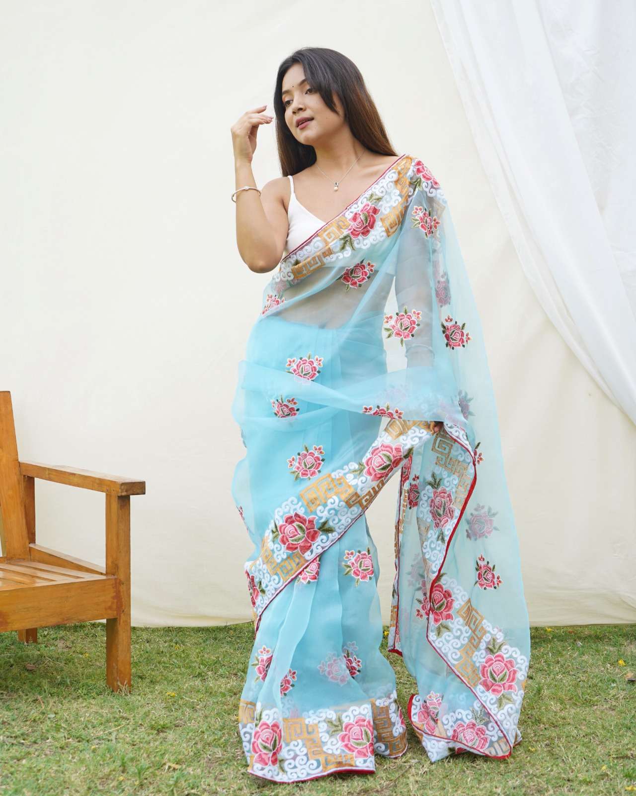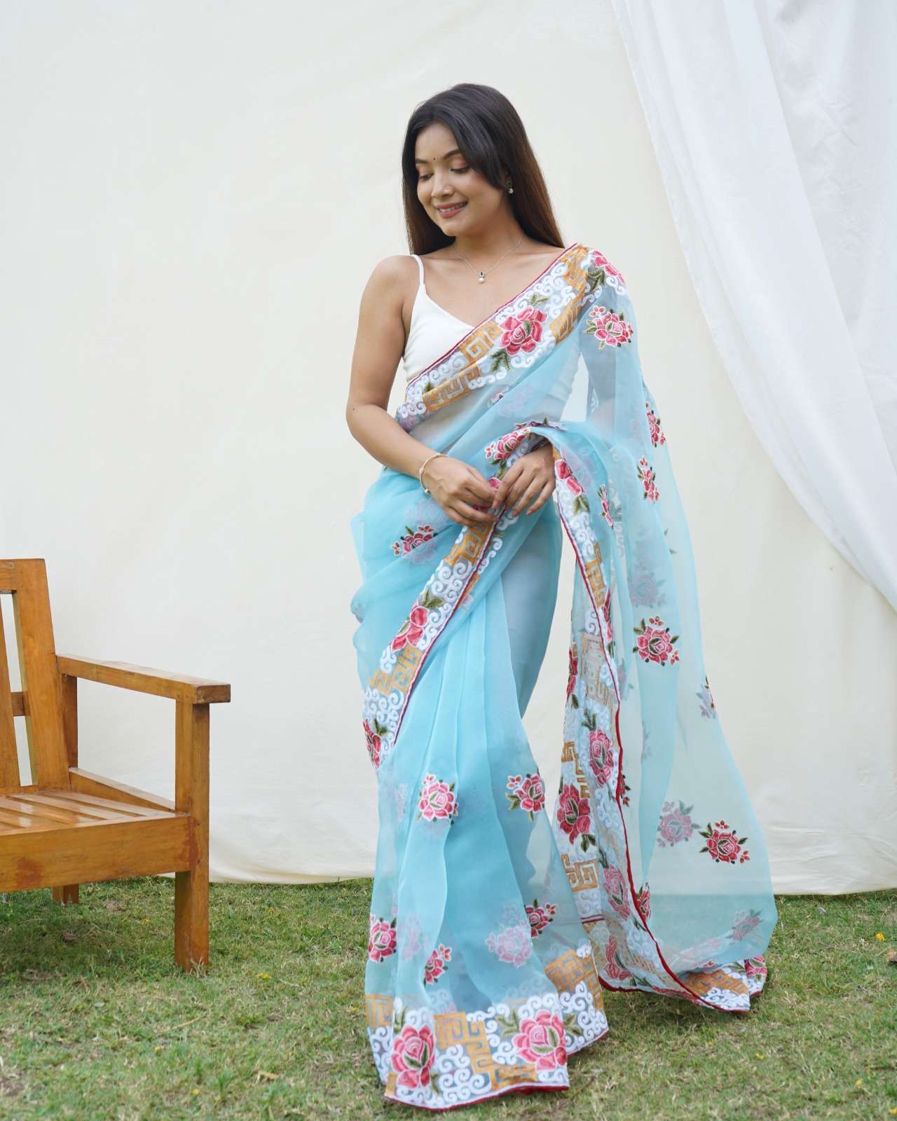Catalog Name : *Nagma* No of Pcs : 1 Fabric : Organza Work : Embrace the ethereal beauty of this Organza saree adorned with intricate Floral Embroidery in Viscos thread. The exquisite craftsmanship and delicate Piping Border add a touch of grace to your attire. with Satin Benglori Blouse