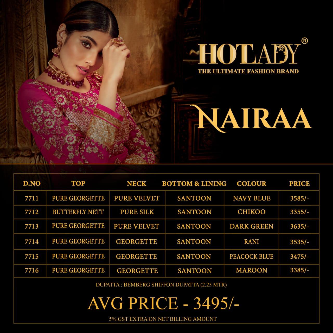 Buy Online Nairaa By Hotlady Series 7711 To 7716 Designer Party Wear Suits Set Nd Single Wholesale Supplier Gujarat 6 Pcs of Full Catalogue at Wholesale Price. Looking for Nairaa By Hotlady Series 7711 To 7716 Designer Party Wear Suits Set Nd Single Wholesale Supplier Gujarat Full Catalouge at Best Price? Buy Now Nairaa By Hotlady Series 7711 To 7716 Designer Party Wear Suits Set Nd Single Wholesale Supplier Gujarat at Wholesale Rate of Rs 20970 with Total 6 Pcs from authroized dealer and supplier of HOTLADY Brand. Cost of Each piece is just only Rs 3495 which is very low and affordable price to resale the product in your retail store ,This is Surat based Wholesale Supplier & Dealer of HOTLADY Brand. Click on Brand name to Know more about HOTLADY Brand's products.Call or Whatsapp on 9898838984 for booking or enquiry