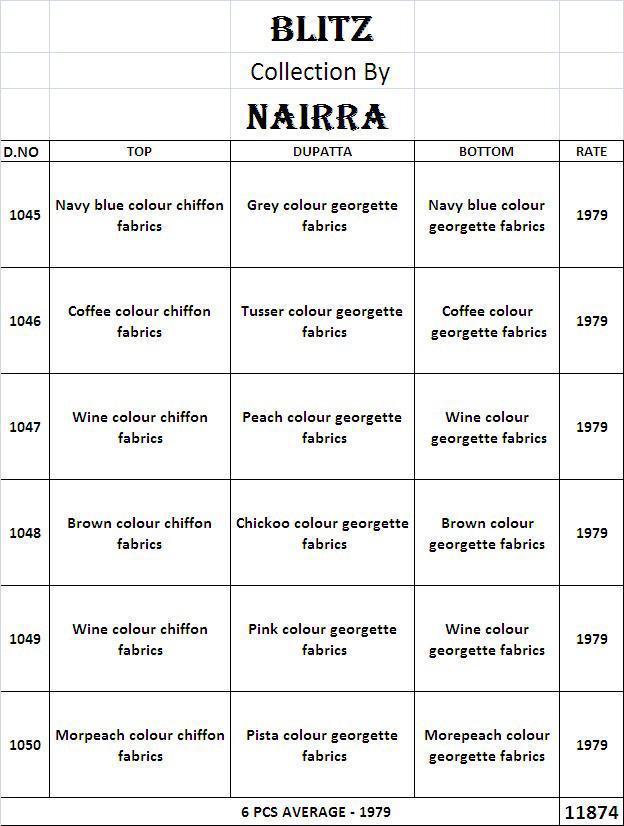 Buy Online Nairra Blitz By Nakkashi Nairra Series 1045 To 1050 Chiffon Designer Party Wear Suits Wholesale Supplier Gujarat 6 Pcs of Full Catalogue at Wholesale Price. Looking for Nairra Blitz By Nakkashi Nairra Series 1045 To 1050 Chiffon Designer Party Wear Suits Wholesale Supplier Gujarat Full Catalouge at Best Price? Buy Now Nairra Blitz By Nakkashi Nairra Series 1045 To 1050 Chiffon Designer Party Wear Suits Wholesale Supplier Gujarat at Wholesale Rate of Rs 11874 with Total 6 Pcs from authroized dealer and supplier of NAKKASHI Brand. Cost of Each piece is just only Rs 1979 which is very low and affordable price to resale the product in your retail store ,This is Surat based Wholesale Supplier & Dealer of NAKKASHI Brand. Click on Brand name to Know more about NAKKASHI Brand's products.Call or Whatsapp on 9898838984 for booking or enquiry