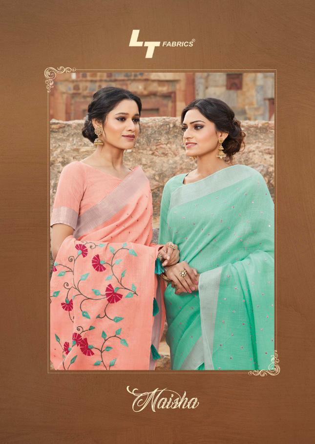 Brand - LT. Type - Saree. New catlog. LT Naisha Linen silk with Mirror work . Rate -1155 per pcs . Set To Set. GST 5 Percent Extra. Delivery 2 days . |