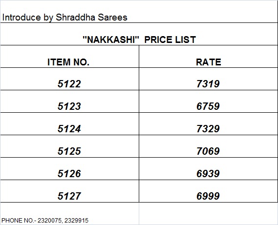 Buy Online Nakkashi 5122 To 5127 Series Fancy Designer Party Wear Lehenga Collection Wholesale Dealer Surat 6 Pcs of Full Catalogue at Wholesale Price. Looking for Nakkashi 5122 To 5127 Series Fancy Designer Party Wear Lehenga Collection Wholesale Dealer Surat Full Catalouge at Best Price? Buy Now Nakkashi 5122 To 5127 Series Fancy Designer Party Wear Lehenga Collection Wholesale Dealer Surat at Wholesale Rate of Rs 0 with Total 6 Pcs from authroized dealer and supplier of NAKKASHI Brand. Cost of Each piece is just only Rs 0 which is very low and affordable price to resale the product in your retail store ,This is Surat based Wholesale Supplier & Dealer of NAKKASHI Brand. Click on Brand name to Know more about NAKKASHI Brand's products.Call or Whatsapp on 9898838984 for booking or enquiry