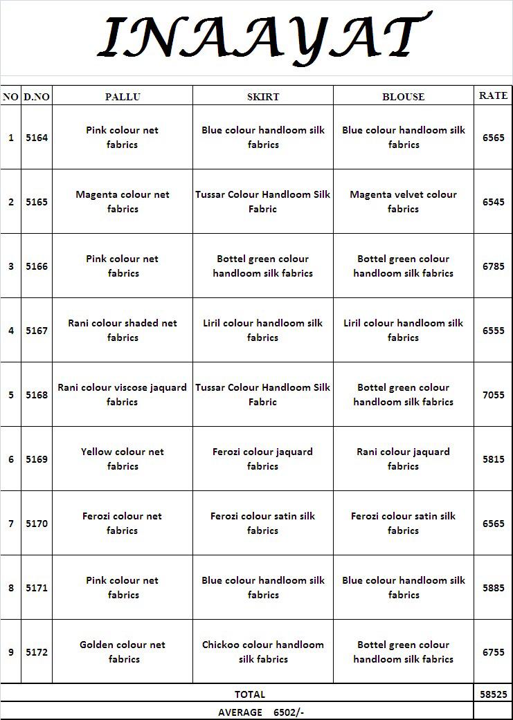 *NAKKASHI* *INAAYAT* *5164 SERIES* *RATE LIST & FABRIC DESCRIPTION ATTACHED* *RATE+GST+$* Single Extra 100 *GST:-12%* *PRE-BOOKING START* *DISPATCH:-16 JANUARY* *DROP ORDER BEST....??* |