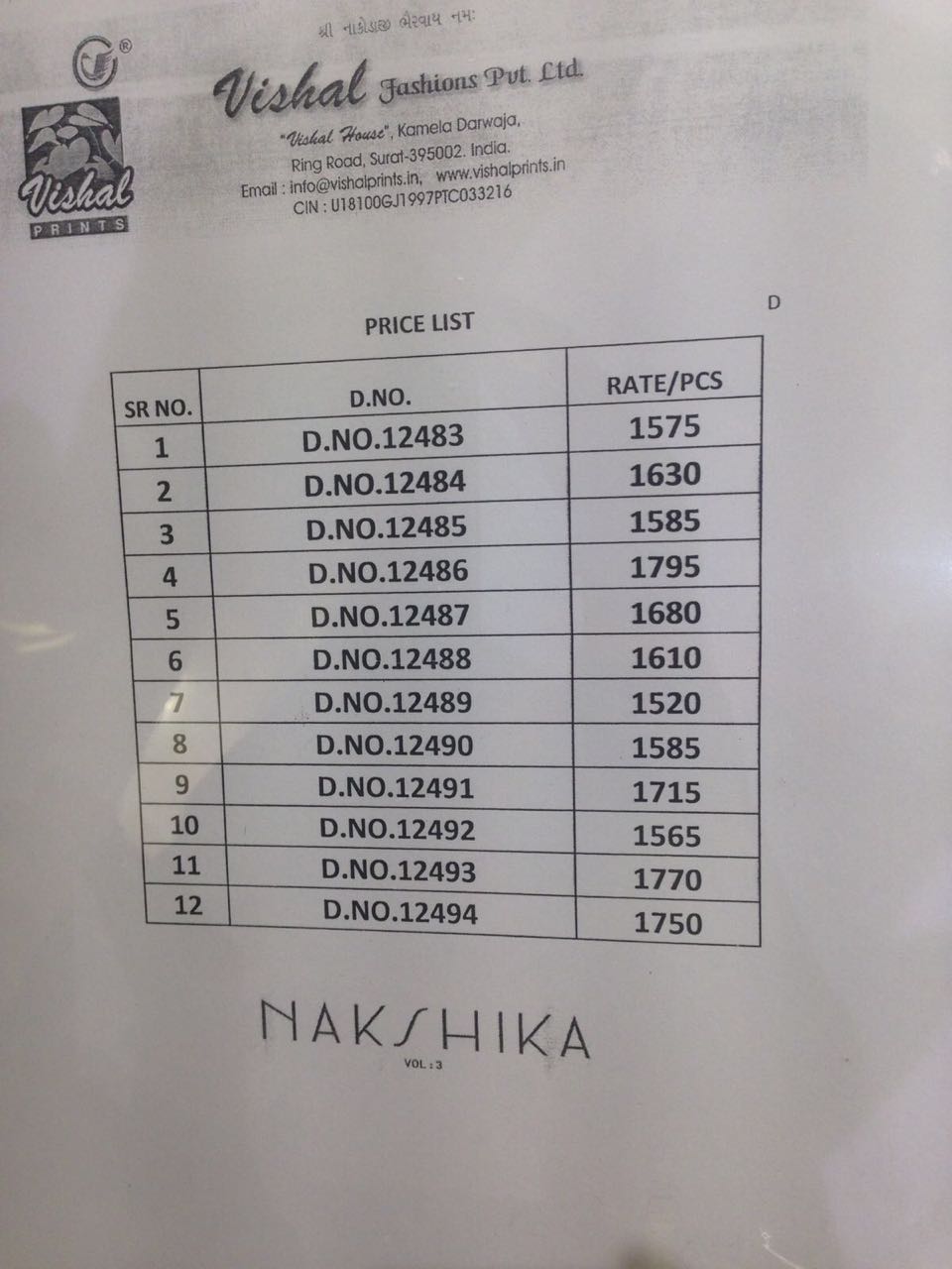 Buy Online Nakshika Vol 3 By Vishal Prints Wholesale Supplier And Dealer Surat 12 Pcs of Full Catalogue at Wholesale Price. Looking for Nakshika Vol 3 By Vishal Prints Wholesale Supplier And Dealer Surat Full Catalouge at Best Price? Buy Now Nakshika Vol 3 By Vishal Prints Wholesale Supplier And Dealer Surat at Wholesale Rate of Rs 19788 with Total 12 Pcs from authroized dealer and supplier of VISHAL Brand. Cost of Each piece is just only Rs 1649 which is very low and affordable price to resale the product in your retail store ,This is Surat based Wholesale Supplier & Dealer of VISHAL Brand. Click on Brand name to Know more about VISHAL Brand's products.Call or Whatsapp on 9898838984 for booking or enquiry