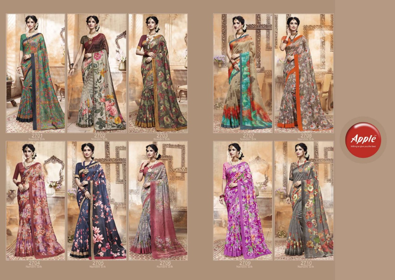 Buy Online Nandini Silk By Apple Sarees Wholesale Supplier And Dealer Surat 10 Pcs of Full Catalogue at Wholesale Price. Looking for Nandini Silk By Apple Sarees Wholesale Supplier And Dealer Surat Full Catalouge at Best Price? Buy Now Nandini Silk By Apple Sarees Wholesale Supplier And Dealer Surat at Wholesale Rate of Rs 6950 with Total 10 Pcs from authroized dealer and supplier of APPLE Brand. Cost of Each piece is just only Rs 695 which is very low and affordable price to resale the product in your retail store ,This is Surat based Wholesale Supplier & Dealer of APPLE Brand. Click on Brand name to Know more about APPLE Brand's products.Call or Whatsapp on 9898838984 for booking or enquiry