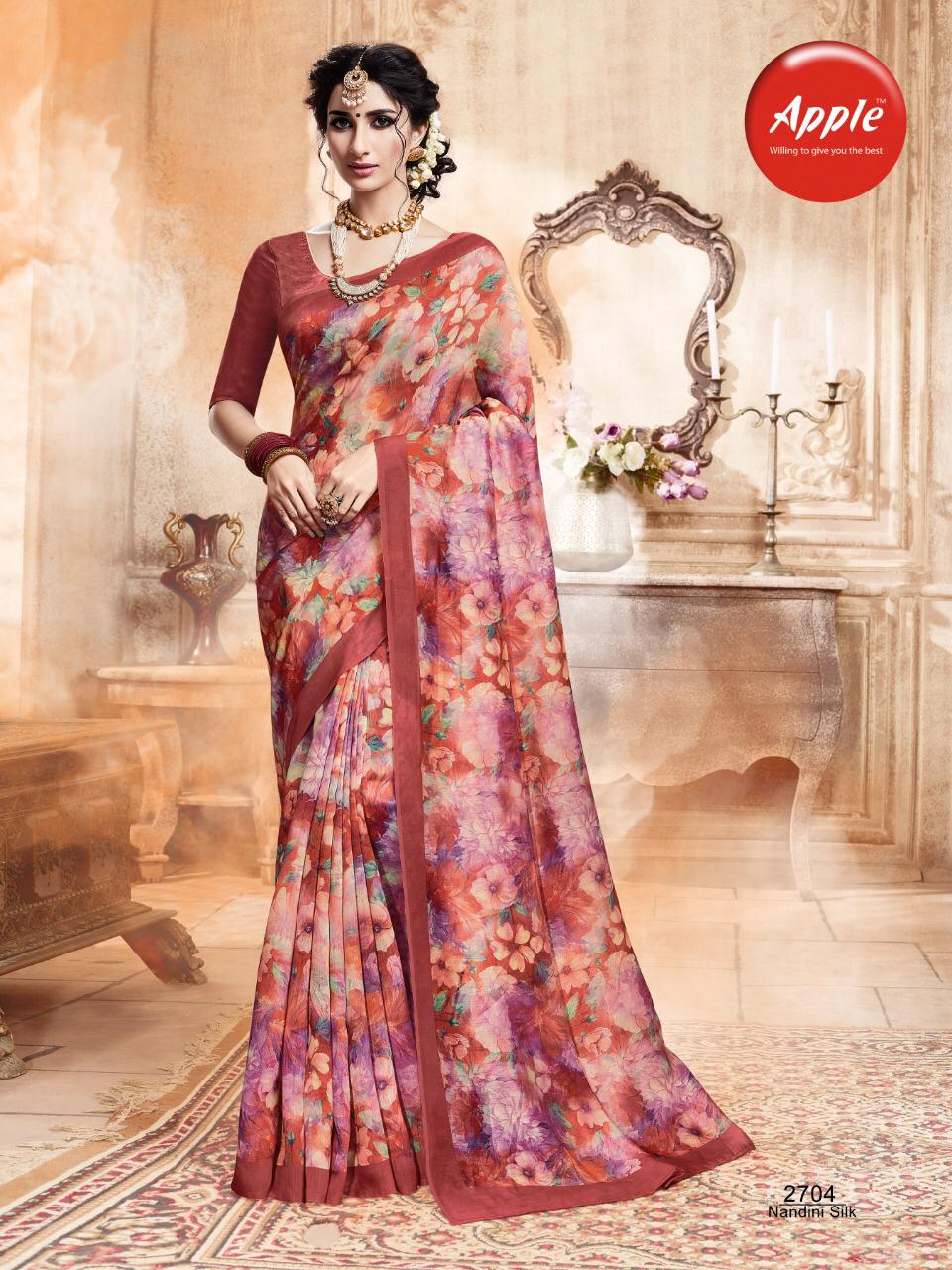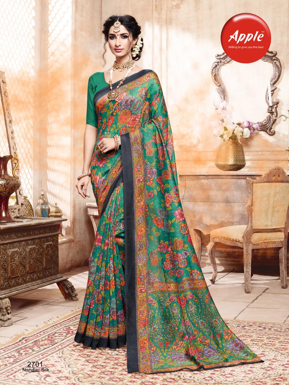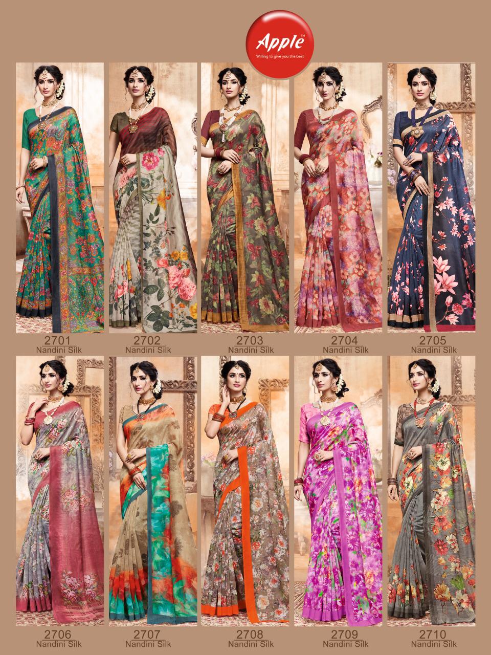 Buy Online Nandini Silk Vol 1 By Apple Silk Printed Sarees Wholesale Supplier Gujarat 10 Pcs of Full Catalogue at Wholesale Price. Looking for Nandini Silk Vol 1 By Apple Silk Printed Sarees Wholesale Supplier Gujarat Full Catalouge at Best Price? Buy Now Nandini Silk Vol 1 By Apple Silk Printed Sarees Wholesale Supplier Gujarat at Wholesale Rate of Rs 6950 with Total 10 Pcs from authroized dealer and supplier of APPLE Brand. Cost of Each piece is just only Rs 695 which is very low and affordable price to resale the product in your retail store ,This is Surat based Wholesale Supplier & Dealer of APPLE Brand. Click on Brand name to Know more about APPLE Brand's products.Call or Whatsapp on 9898838984 for booking or enquiry