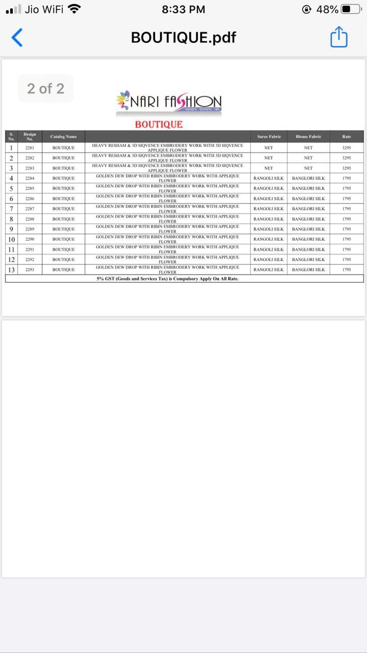 Brand - Naree. Catlog name - BOUTIQUE. Series - 2281 to 2293. Set & loose & singel . Single extra 100 GST 5 Percent Extra. Delivery- Today |