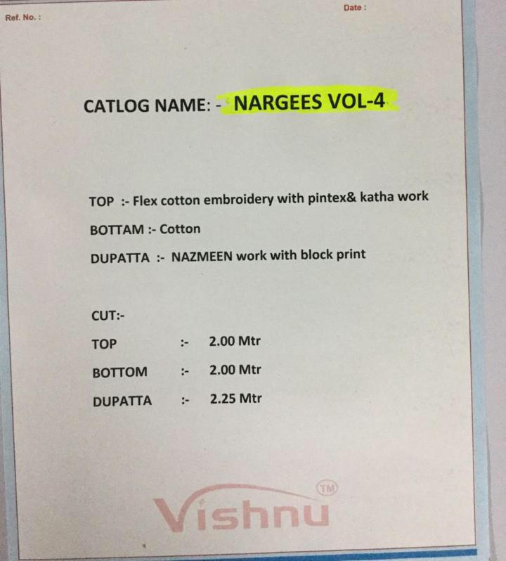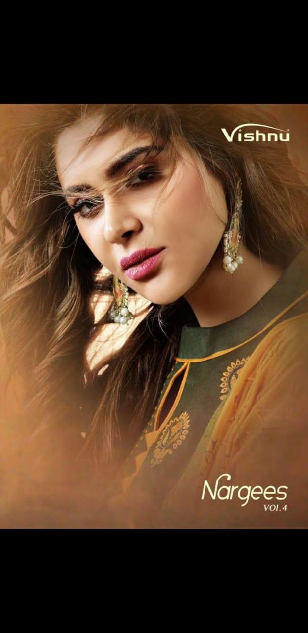 Brand - Vishnu Impex. Catlog name - NARGESS VOL -4. Rate -650 per pcs. Set To Set: GST 5 Percent Extra. Delivery from-06-04-19. |