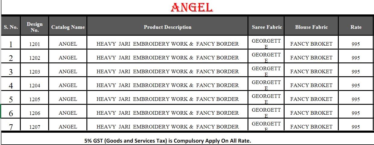 Brand - Naree. Series -1201 to 1207. Catlog name - ANGEL. GST 5 Percent Extra. Delivery-07-05-18. Book your order |