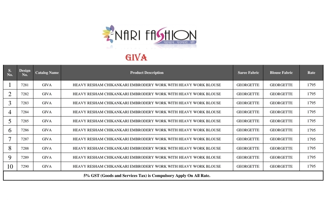 Buy Online Nari Fashion New Launching Giva Designer Georgette Sarees 10 Pcs of Full Catalogue at Wholesale Price. Looking for Nari Fashion New Launching Giva Designer Georgette Sarees Full Catalouge at Best Price? Buy Now Nari Fashion New Launching Giva Designer Georgette Sarees at Wholesale Rate of Rs 17950 with Total 10 Pcs from authroized dealer and supplier of Nari Fashion Brand. Cost of Each piece is just only Rs 1795 which is very low and affordable price to resale the product in your retail store ,This is Surat based Wholesale Supplier & Dealer of Nari Fashion Brand. Click on Brand name to Know more about Nari Fashion Brand's products.Call or Whatsapp on 9898838984 for booking or enquiry