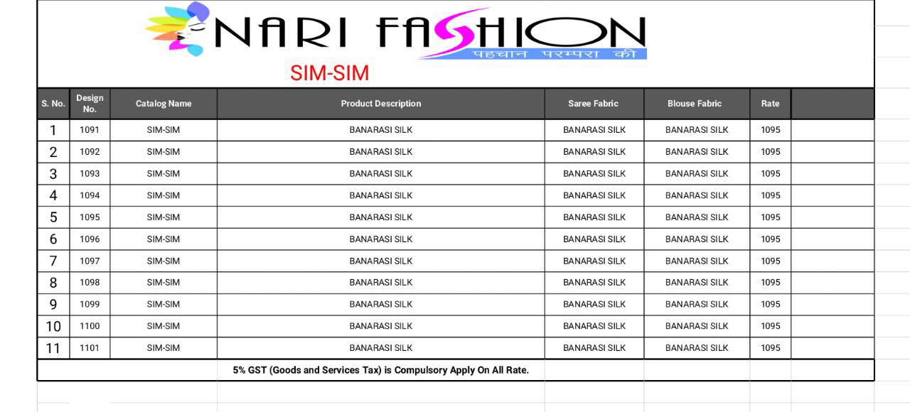 Brand - Nari fashion . Catlog name - SIM SIM. Series -1091 to 1101. 11 PIECE 1095/- PER PIECE GST 5 Percent Extra. Book your order. |