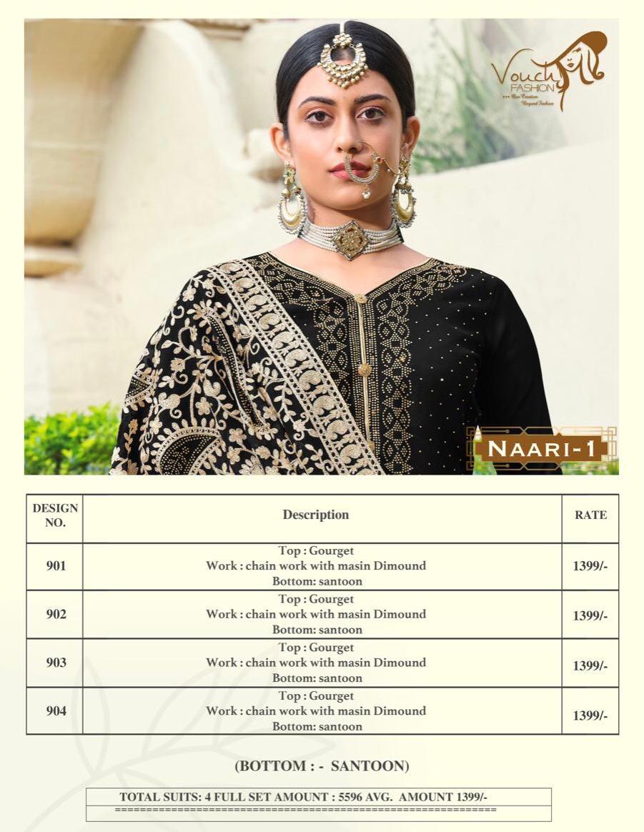 Buy Online Nari Vol 1 Series 901 To 904 By Vouch Fashion Single And Set Stockiest And Supplier From Surat 4 Pcs of Full Catalogue at Wholesale Price. Looking for Nari Vol 1 Series 901 To 904 By Vouch Fashion Single And Set Stockiest And Supplier From Surat Full Catalouge at Best Price? Buy Now Nari Vol 1 Series 901 To 904 By Vouch Fashion Single And Set Stockiest And Supplier From Surat at Wholesale Rate of Rs 5596 with Total 4 Pcs from authroized dealer and supplier of Brand. Cost of Each piece is just only Rs 1399 which is very low and affordable price to resale the product in your retail store ,This is Surat based Wholesale Supplier & Dealer of Brand. Click on Brand name to Know more about Brand's products.Call or Whatsapp on 9898838984 for booking or enquiry