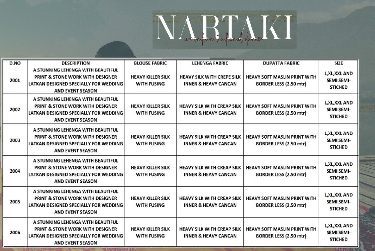 Buy Online Nartaki Series 2001 To 2006 By Virasat Readymade Lehanga Choli Single And Set Stockiest And Supplier From Surat 6 Pcs of Full Catalogue at Wholesale Price. Looking for Nartaki Series 2001 To 2006 By Virasat Readymade Lehanga Choli Single And Set Stockiest And Supplier From Surat Full Catalouge at Best Price? Buy Now Nartaki Series 2001 To 2006 By Virasat Readymade Lehanga Choli Single And Set Stockiest And Supplier From Surat at Wholesale Rate of Rs 0 with Total 6 Pcs from authroized dealer and supplier of Brand. Cost of Each piece is just only Rs 0 which is very low and affordable price to resale the product in your retail store ,This is Surat based Wholesale Supplier & Dealer of Brand. Click on Brand name to Know more about Brand's products.Call or Whatsapp on 9898838984 for booking or enquiry