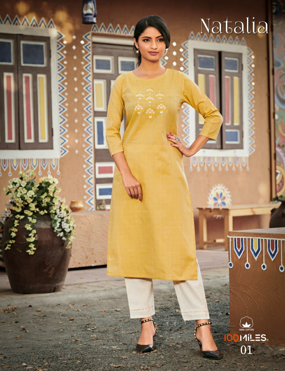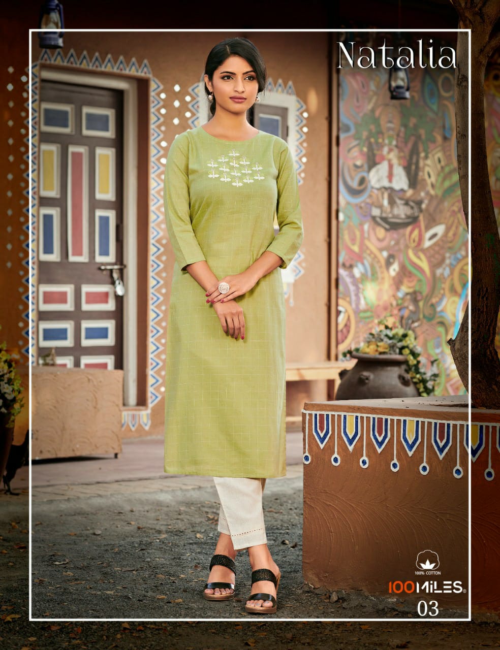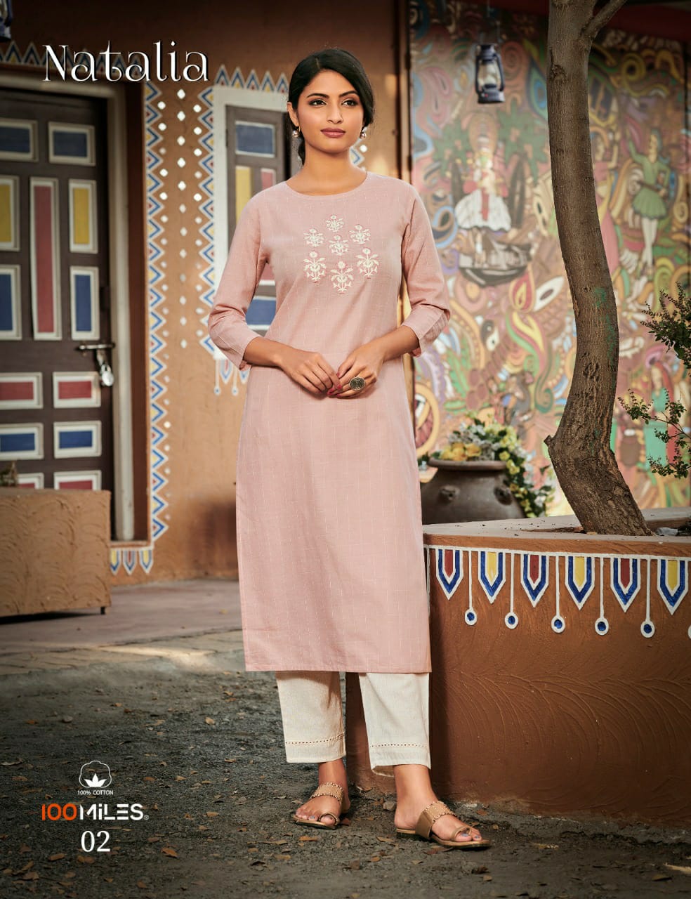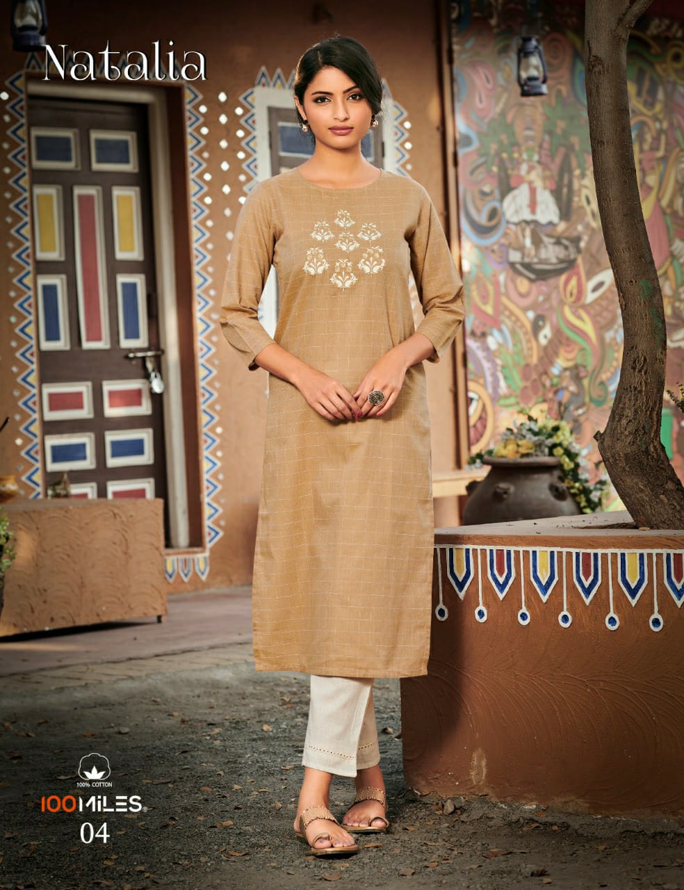 *Brand :* 100 miles *Catalog Name :* Natalia *Price :* ?420 *Piece :* 4 *Total Price :* 1680 ( GST Extra ) *Size :* S,M,L,XL,XXL,XXXL *Fabric :* cotton *Availibility :* On Booking |