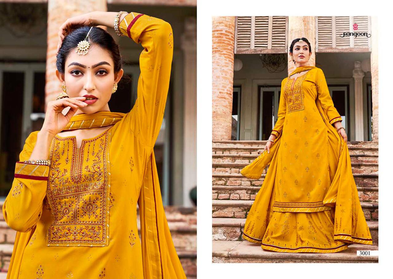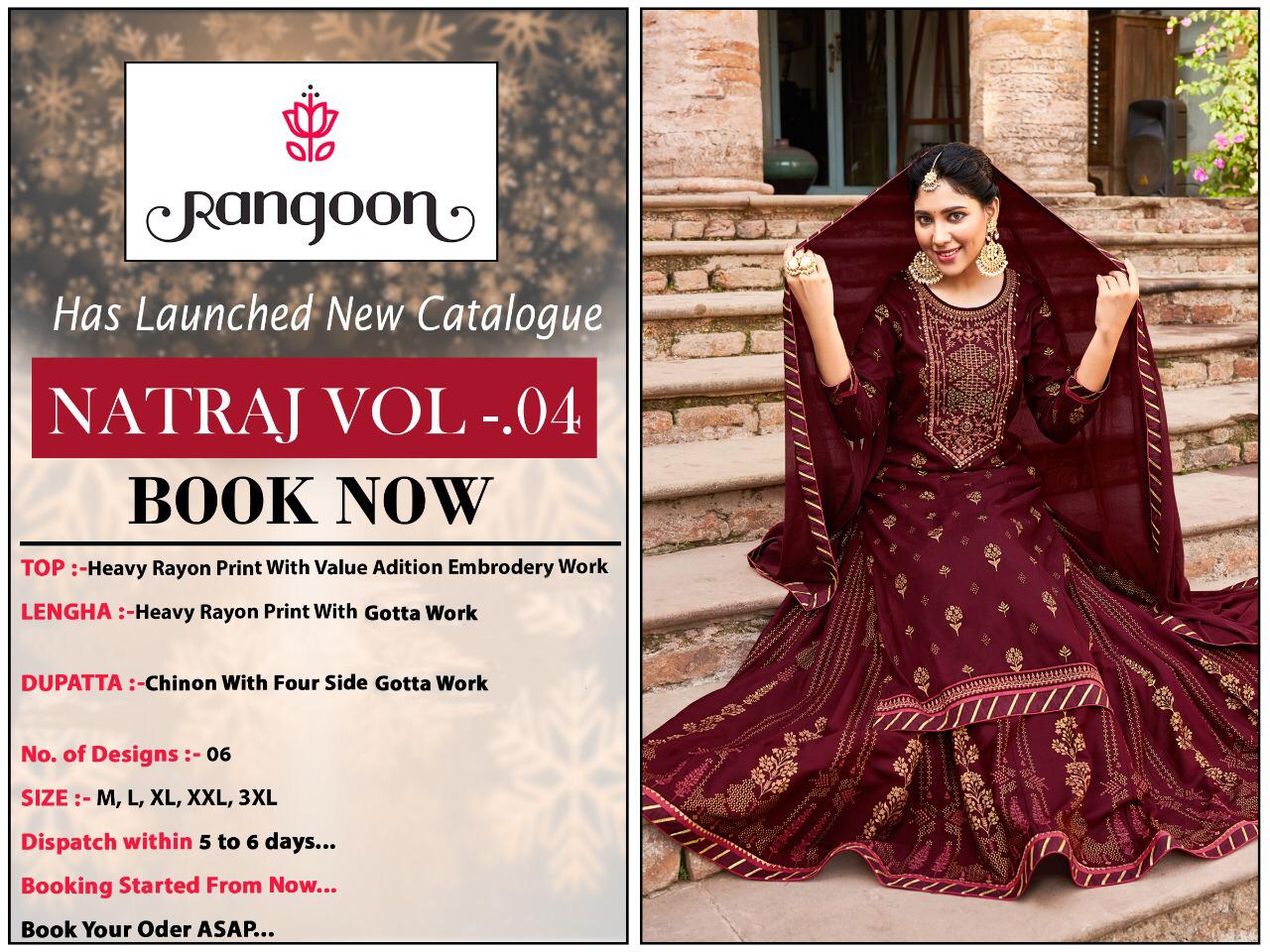 ??Dear Sir/Madam... Thanks for your support.? ?Today *Rangoon* hitting market with exclusively trending series of Catalogs *Natraj Vol- 04* ??Fabric details ?? ? Top:- Heavy Rayon Print with Value adition Embroidery Work ?Bottom:- Heavy Rayon Print with Value adition Embroidery Work ?Dupatta: Chinon with Four Side Embroidery Work and Gotta work ?No. of Design:- 4 ?Size: M, L, XL, XXL, 3XL Rate, 1099/- ? Set to set |