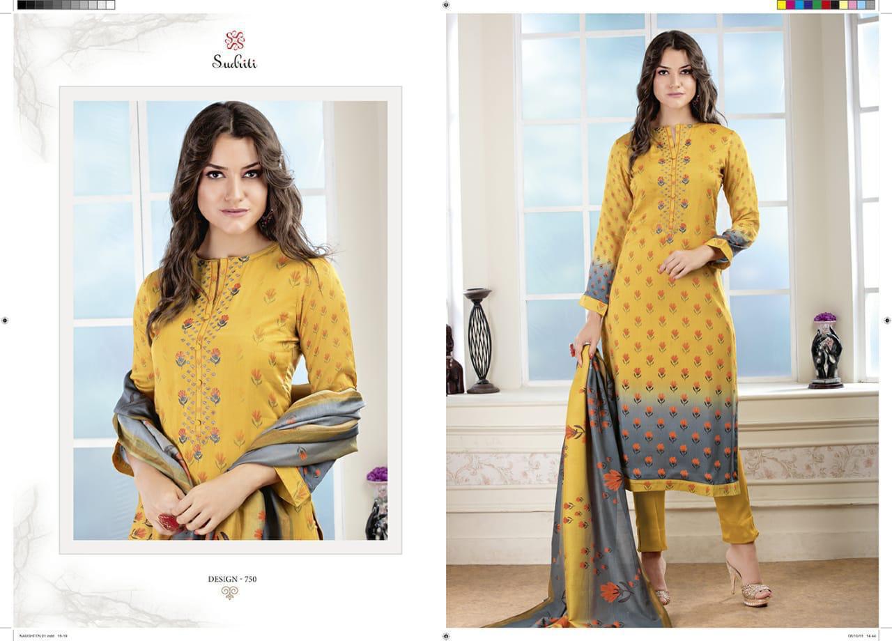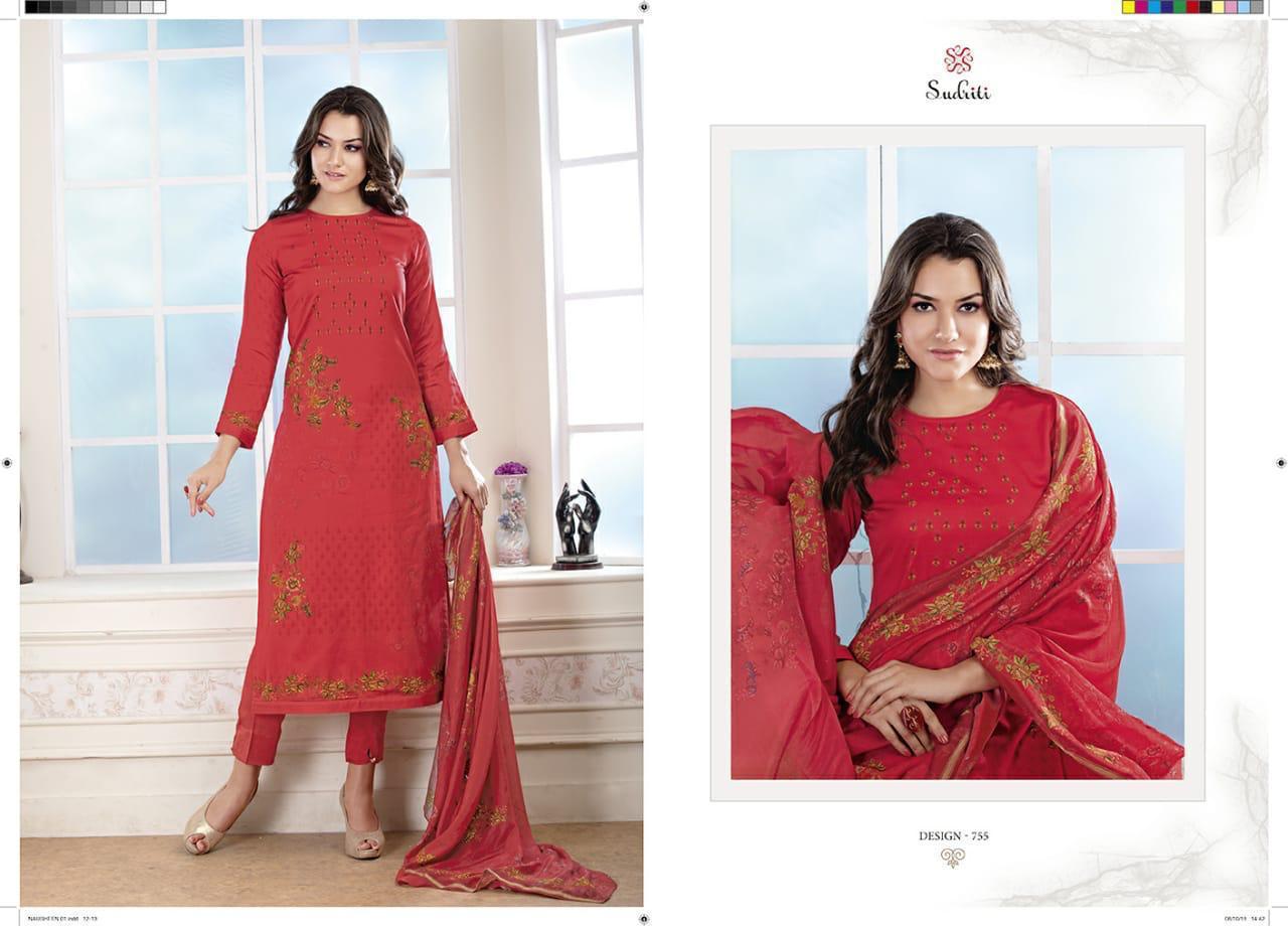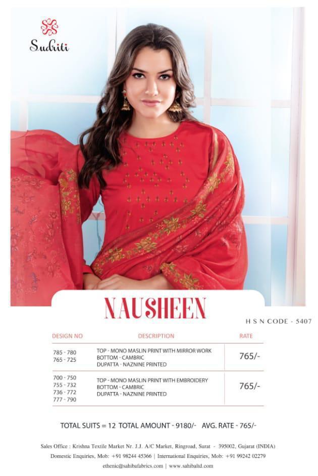 Buy Online Nausheen By Sudriti Muslin Printed Embroidered Designer Suits Wholesale Supplier And Dealer Gujarat 12 Pcs of Full Catalogue at Wholesale Price. Looking for Nausheen By Sudriti Muslin Printed Embroidered Designer Suits Wholesale Supplier And Dealer Gujarat Full Catalouge at Best Price? Buy Now Nausheen By Sudriti Muslin Printed Embroidered Designer Suits Wholesale Supplier And Dealer Gujarat at Wholesale Rate of Rs 9180 with Total 12 Pcs from authroized dealer and supplier of SUDRITI Brand. Cost of Each piece is just only Rs 765 which is very low and affordable price to resale the product in your retail store ,This is Surat based Wholesale Supplier & Dealer of SUDRITI Brand. Click on Brand name to Know more about SUDRITI Brand's products.Call or Whatsapp on 9898838984 for booking or enquiry