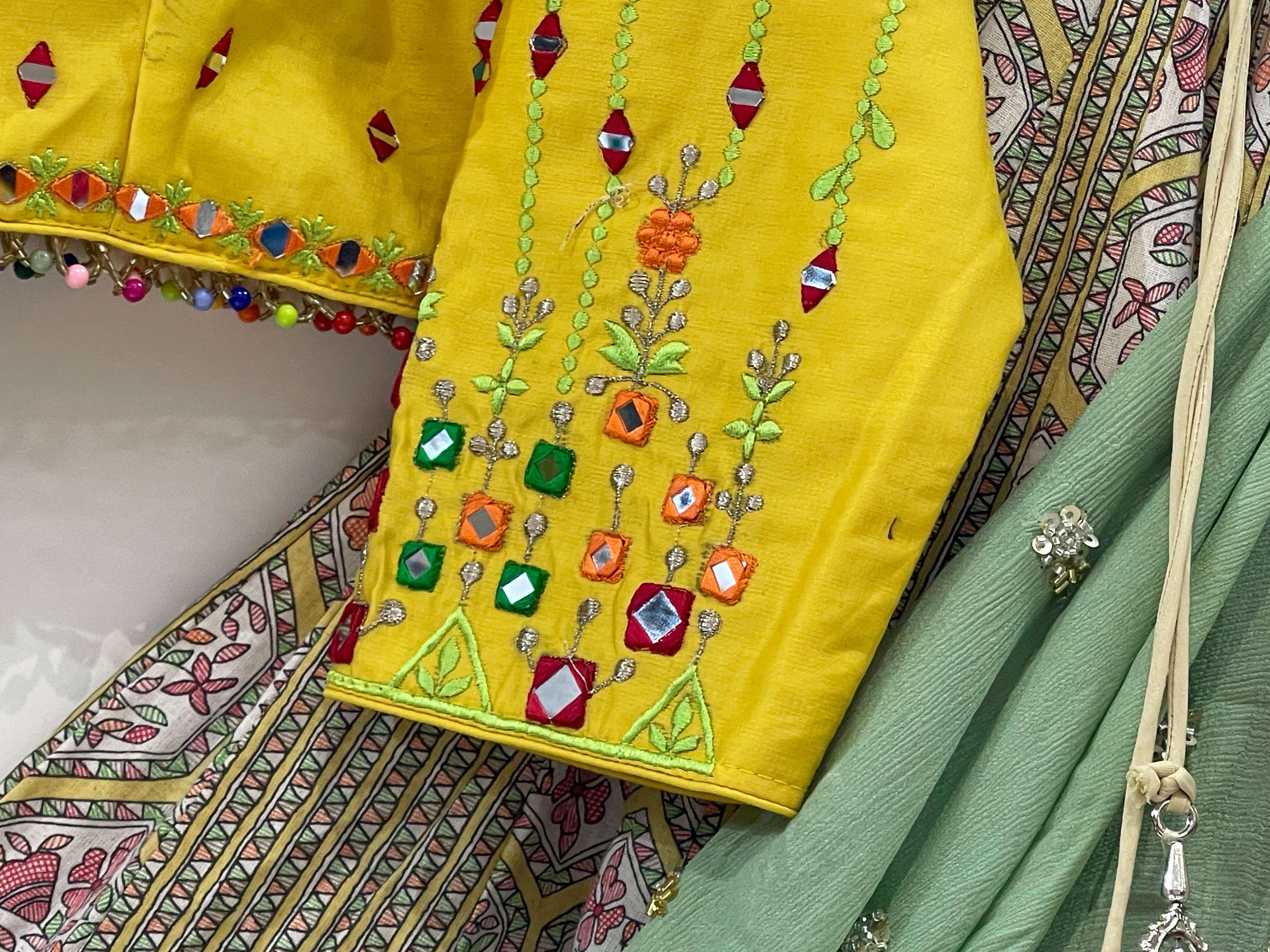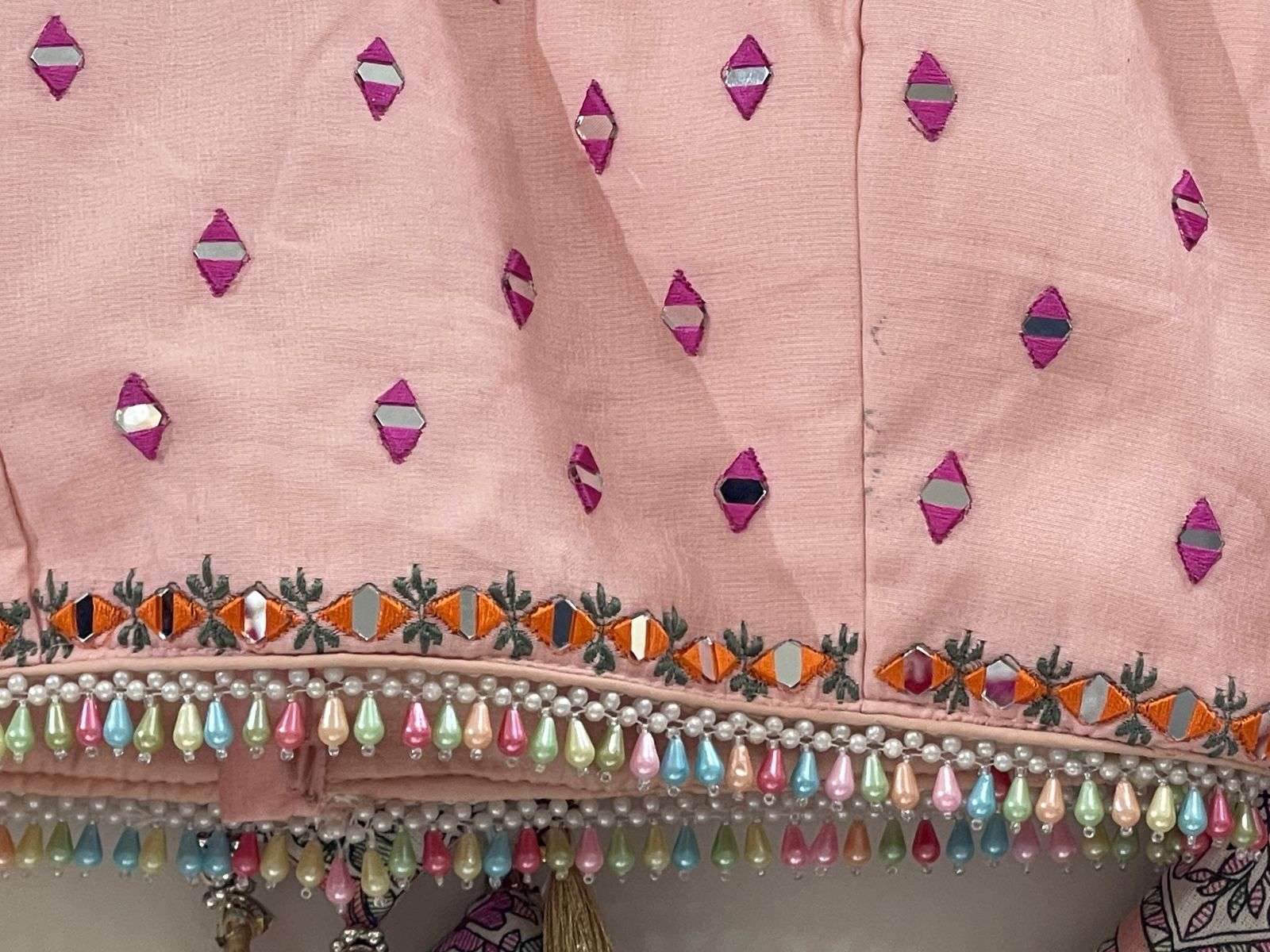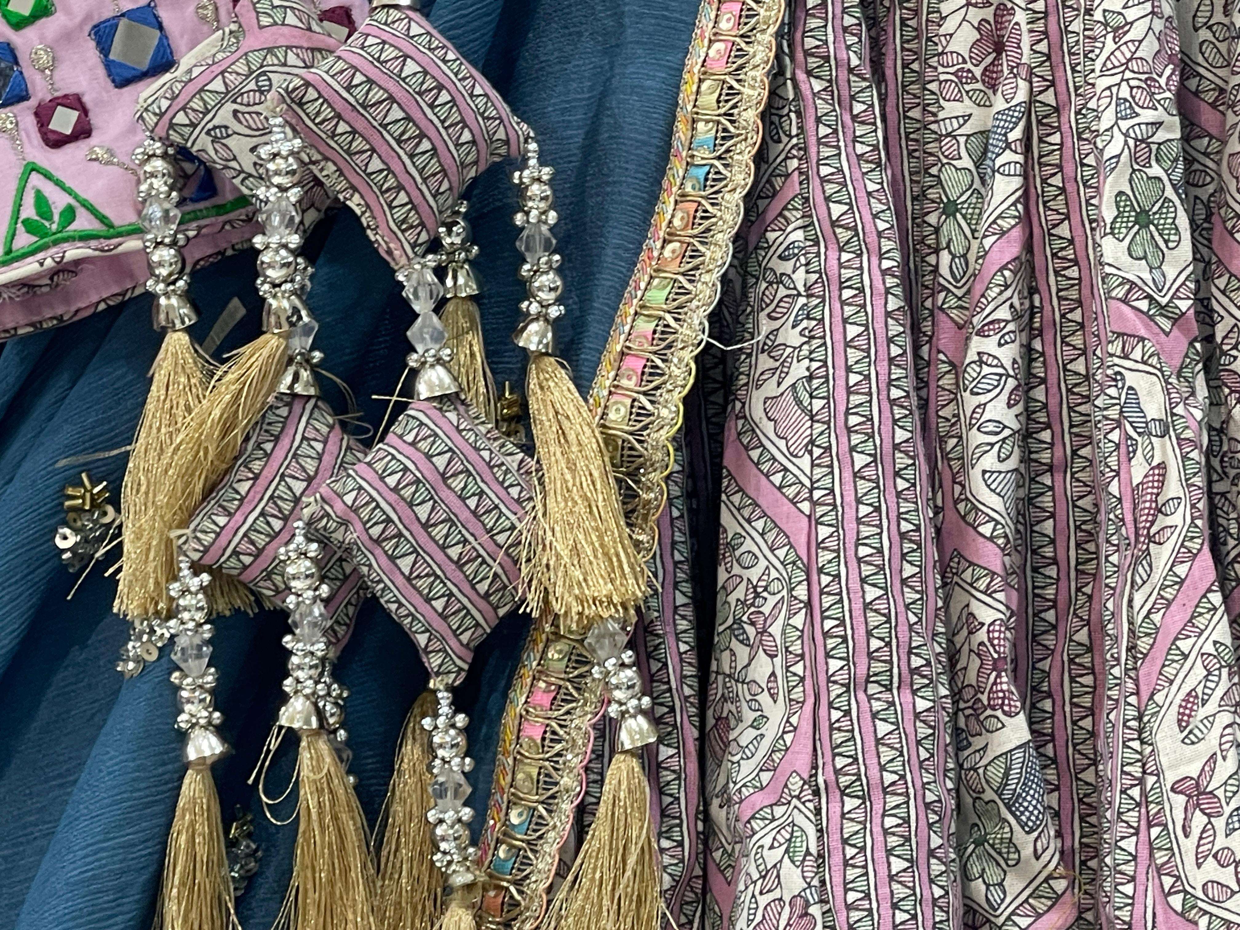 *Skirt/bottom*: *Soft cotton Printed Pestal Colour full big 10/12 mtrs flair light pestal Print kali pattern Aztec print which gives perfect look to lehenga* *Length 40/41”* *Upto 44/46”waist*