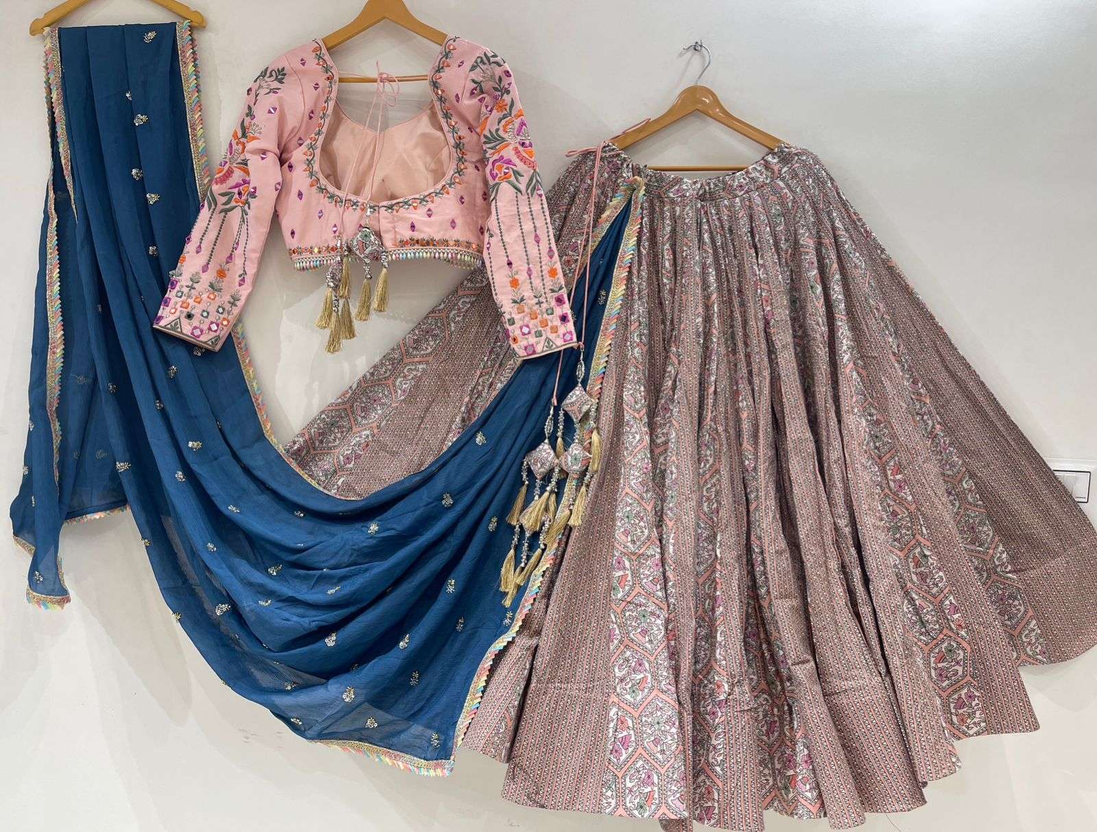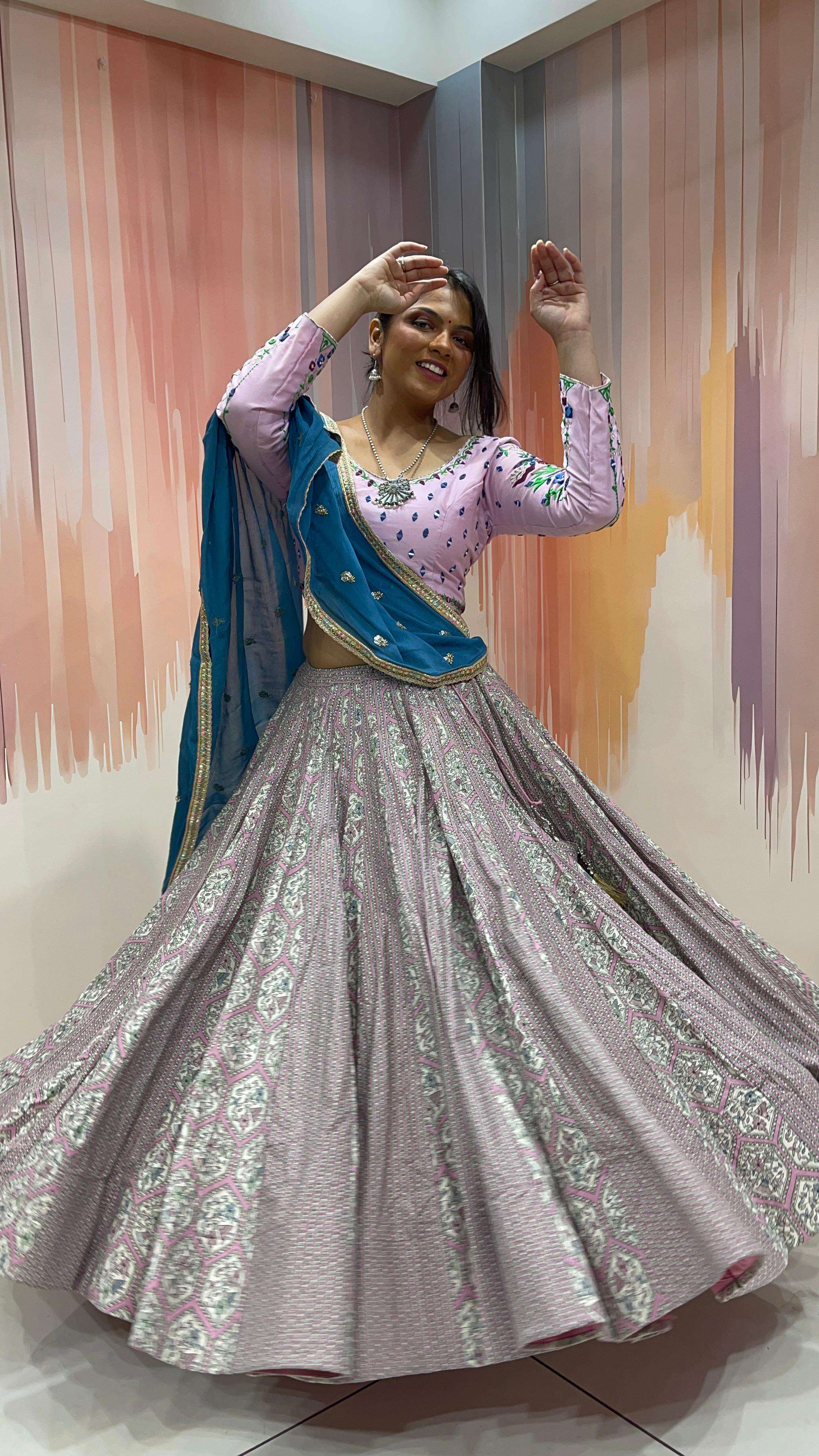 *Indo Western Concept Full long sleeve embroidery Cotton Printed Full ghera approx 10/12 Mtrs in trend Cotton Silk Blouse fusion style Chaniya Choli*