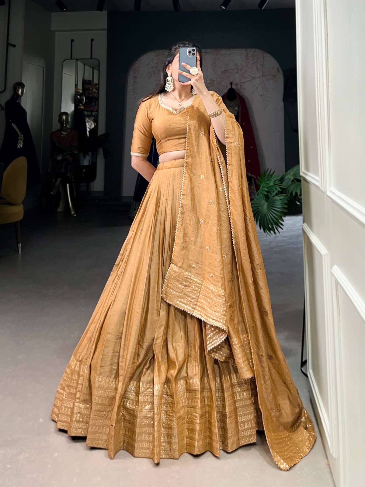 *Lehenga (Stitched)* Lehenga Fabric : Pure Chanderi Lehenga Work : Plain With Zari Weaving Work Border Lehenga Waist : SUPPORTED UP TO 42 Lehenga Closer : Drawstring With Zip Stitching : Stitched With Canvas And Full Inner Length : 42 Flair : 4 Meter Inner : Micro Cotton