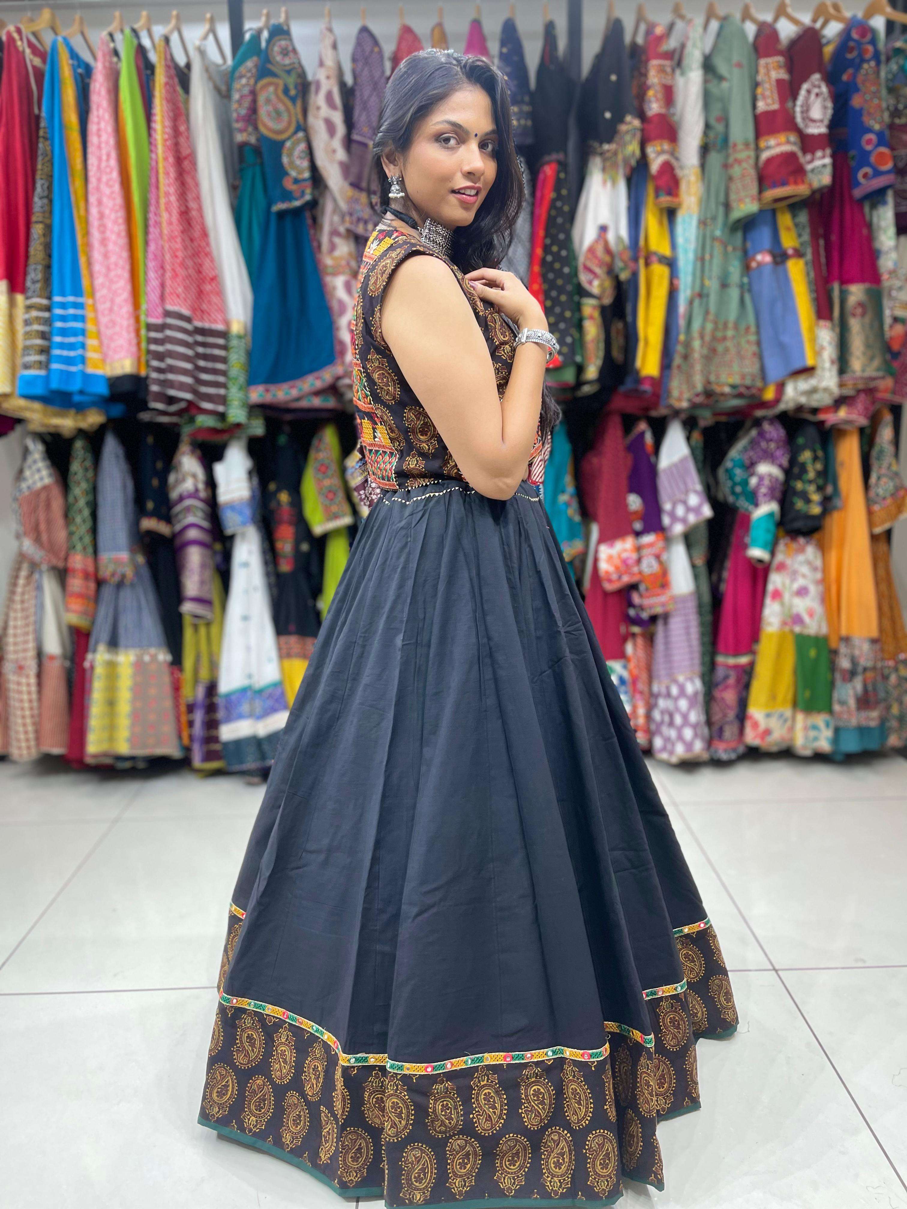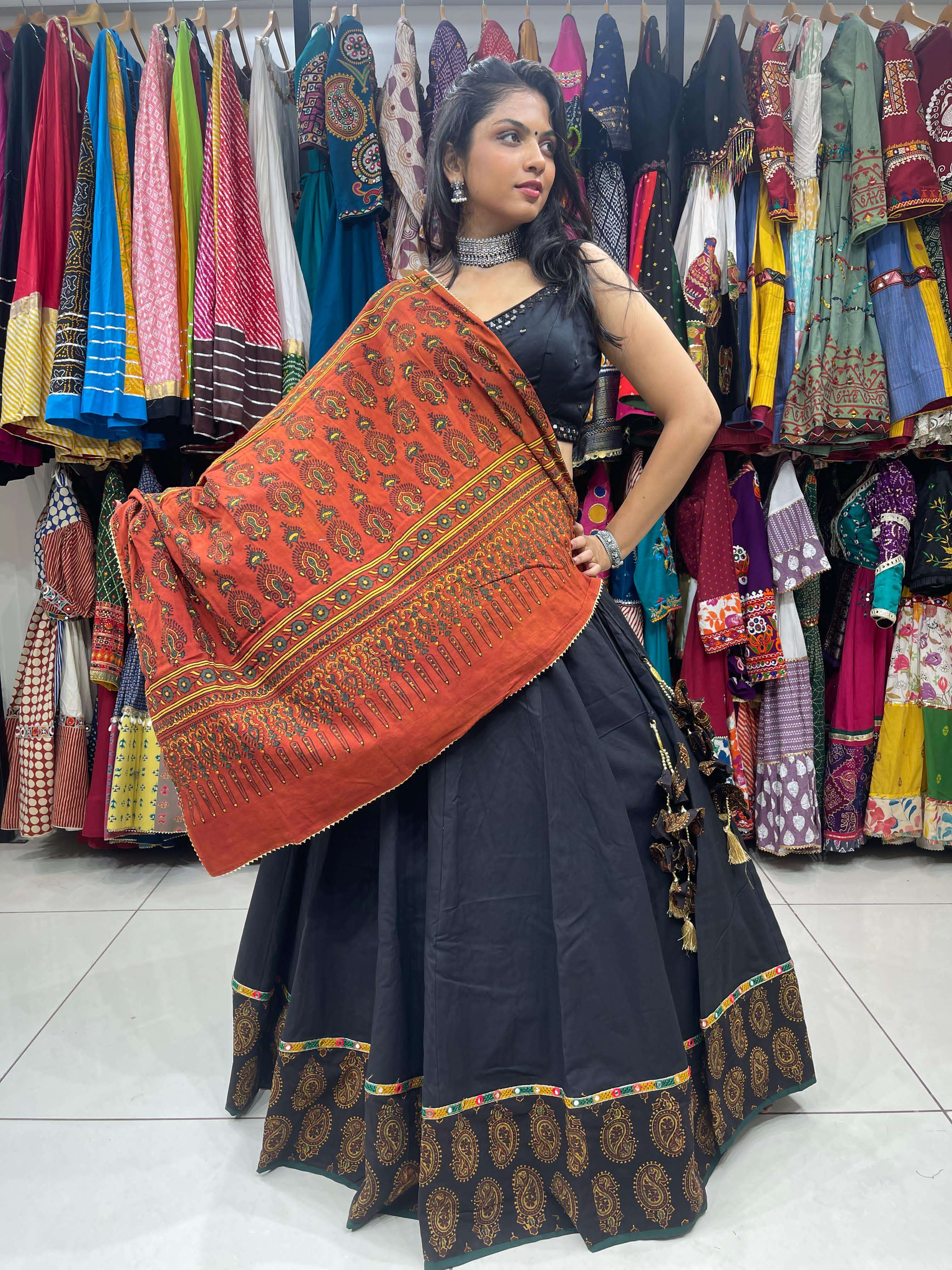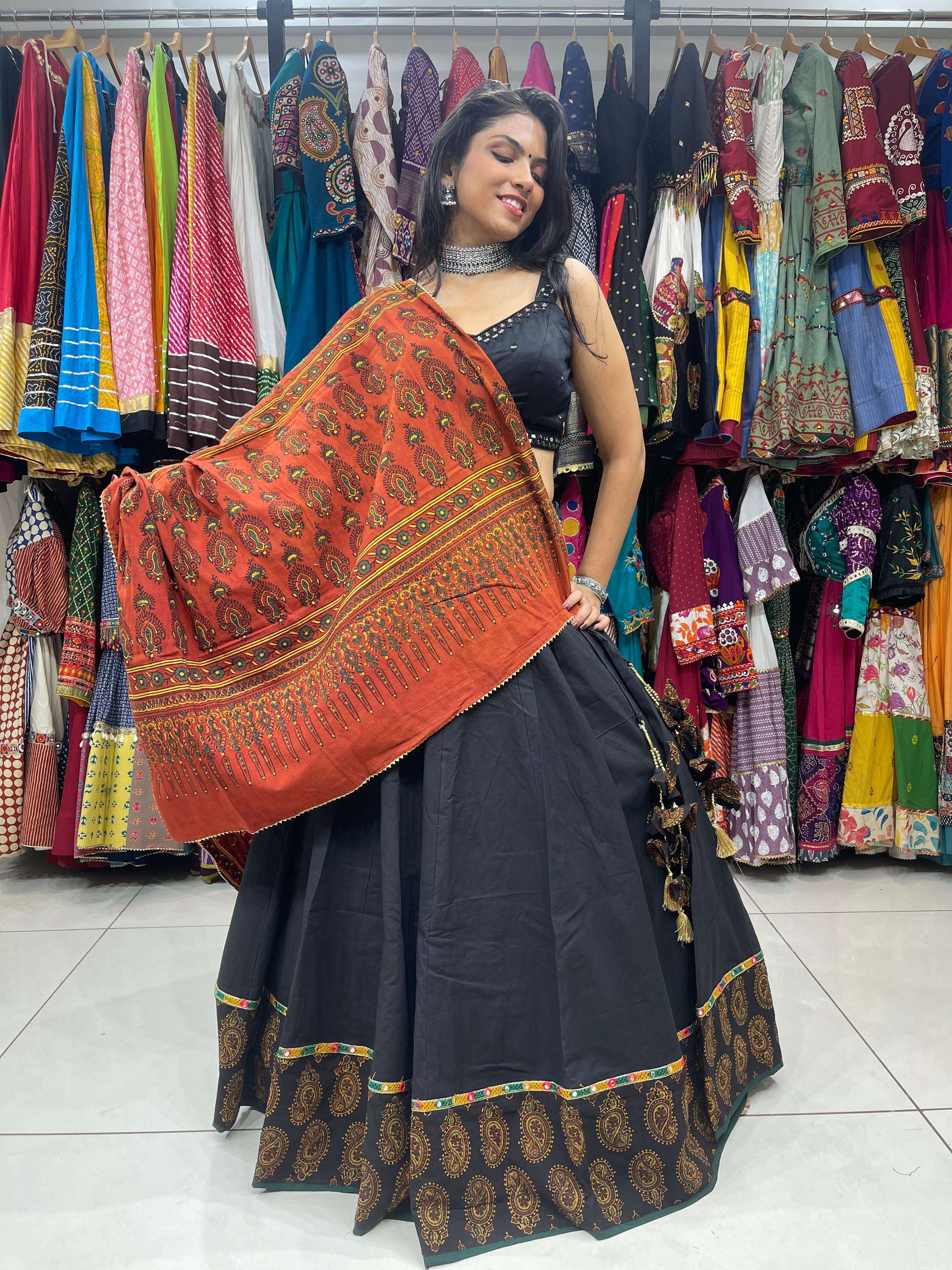 *Skirt/bottom*: *Soft pure cotton ajrakh floral classic print 6.5 Mtrs Ghera & long latkan with ajrakh print mix and march beautiful border which gives perfect look to lehenga* *Length 40/41”* *Upto 42/44” waist*